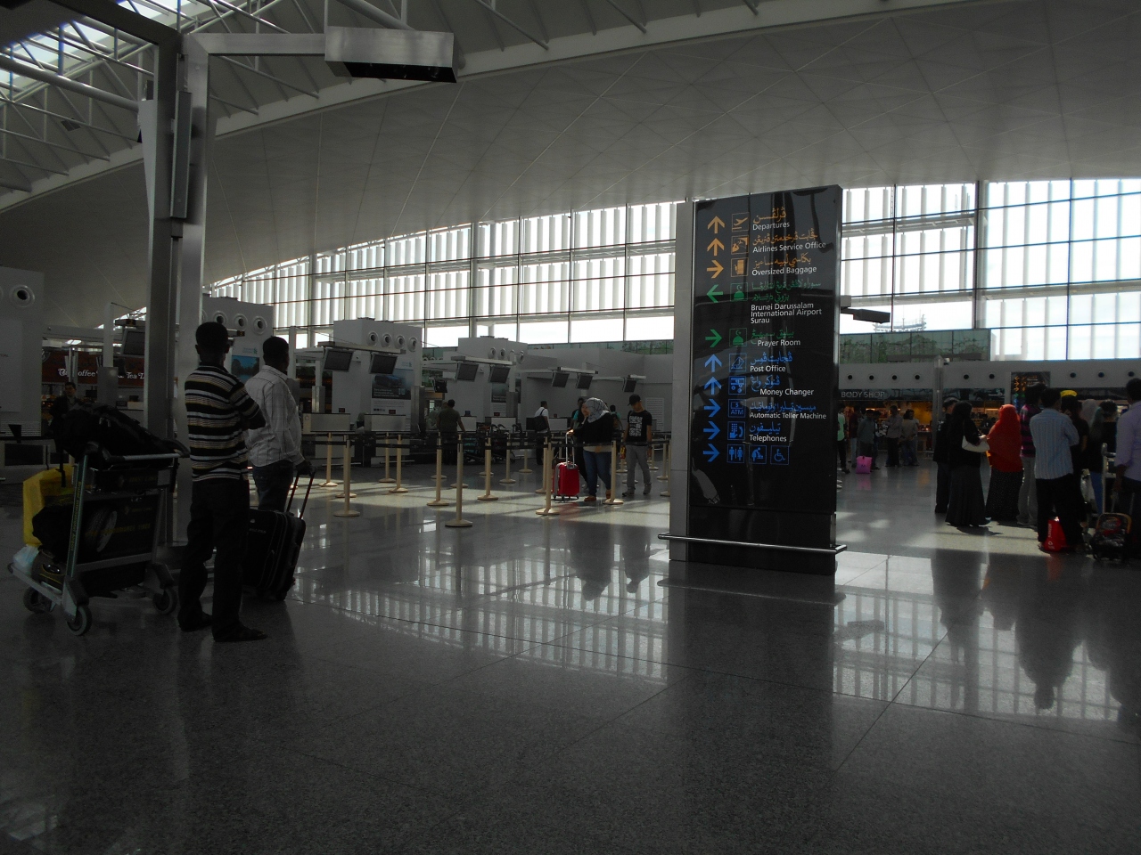 制限エリアにはMubarakコンビニがあり、少し割高ですが水・お菓子類・ブルネイ産のえびせん(ただし揚げる前のやつ)が販売しています。あとブルネイ産ではないけどブルネイTシャツやキャップ、マグを売っているお店など六角形の搭乗フロアにはちらほらお店と階上にコーヒーショップあり。オーストラリアやロンドン方面のフライトへの乗り継ぎ客が結構寝ていました。