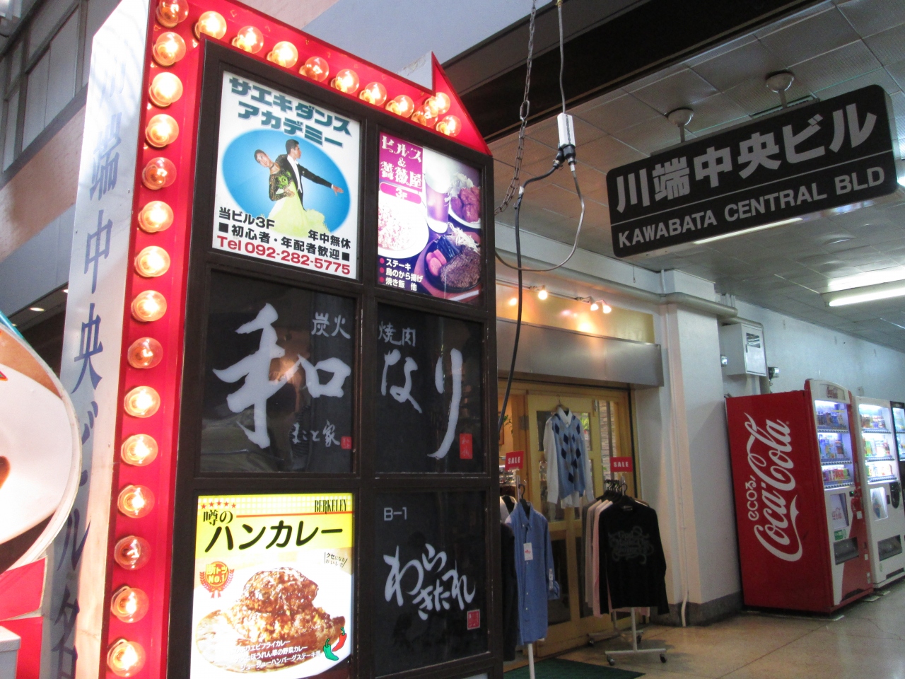 キャナルシティから川端商店街をぶらぶら地下鉄駅に戻る途中に見かけたレトロビルの1F奥にあるお店。中洲で働く女性用のドレスやら、社交ダンスの看板もあるので分りやすいかと思います。
