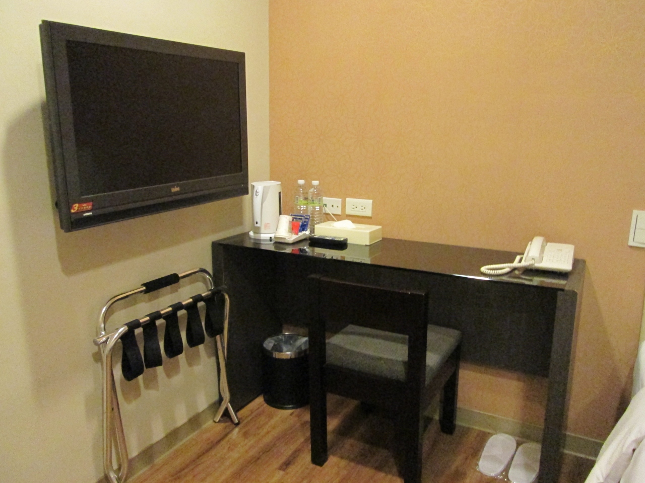 周辺は古くからの繁華街といった風情ですが、ホテルそのものは比較的新しいデザイナーズホテルといった雰囲気。狭い部屋ながら、ダブルベッド(シングルユースしました)にデスクと薄型テレビ、ポット(インスタントコーヒー・お茶パックはあり)と、最低限の施設は備わっています。