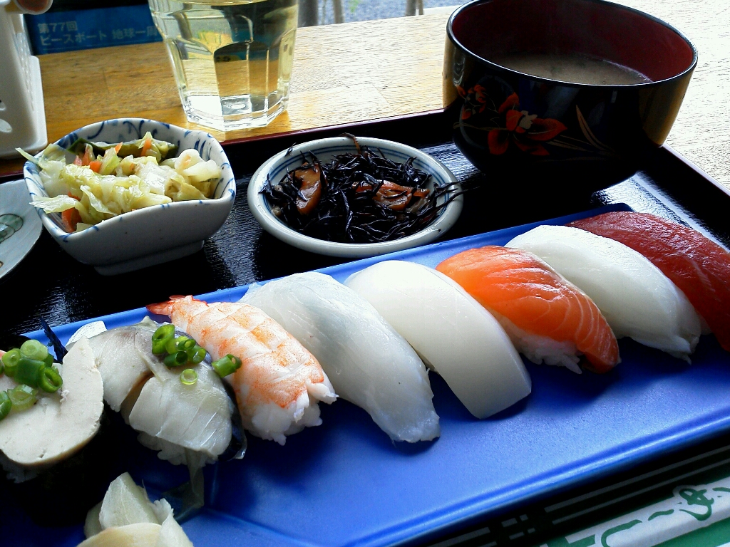 メニューは基本さしみ定食(にぎり9貫+お吸い物+1菜と女性にはかなりのボリューム)が500円。さしみ以外の材料があるときは他のメニューも出ているようです。