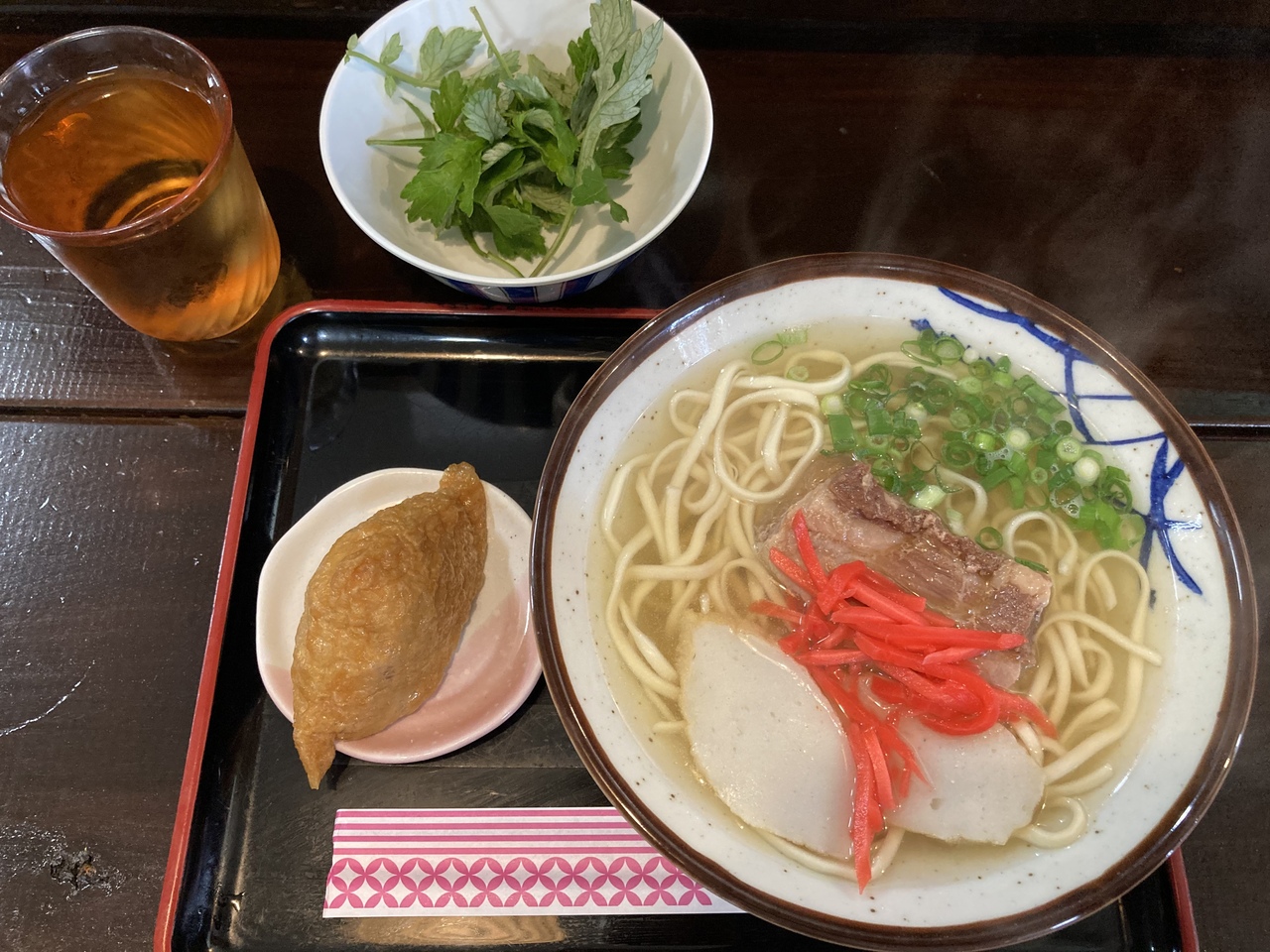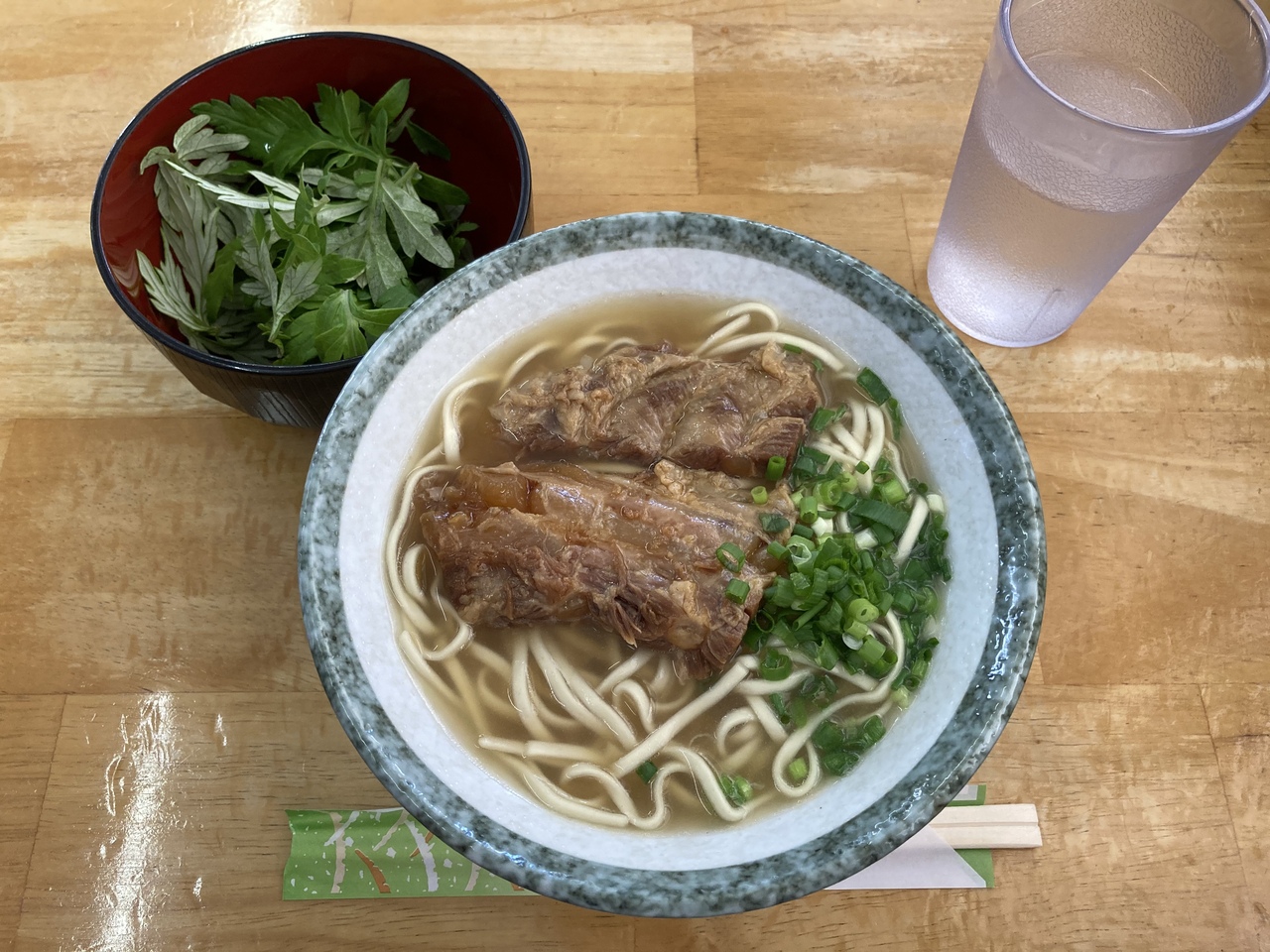 そばにはよもぎ(フーチバー)が別皿で提供されるので、お好きな方は必要な分をどうぞ。他の薬味は紅生姜、七味、コーレーグースあり。