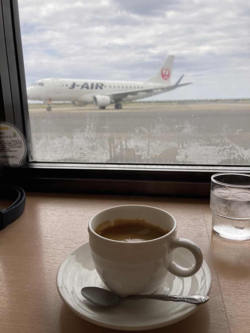 店の一番奥、カウンター席は滑走路側にあり飛行機が望めます。到着便の折り返し便に乗る予定だったので、飛行機が到着したのを確認してからお店を出るぐらいのんびり。
