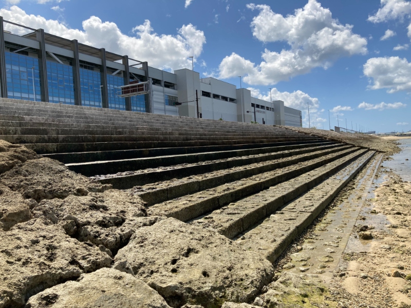 道向かいは干潟が広がっており、横断歩道そばに護岸の向こうに行けるよう階段が設置されています。- 旅行時期