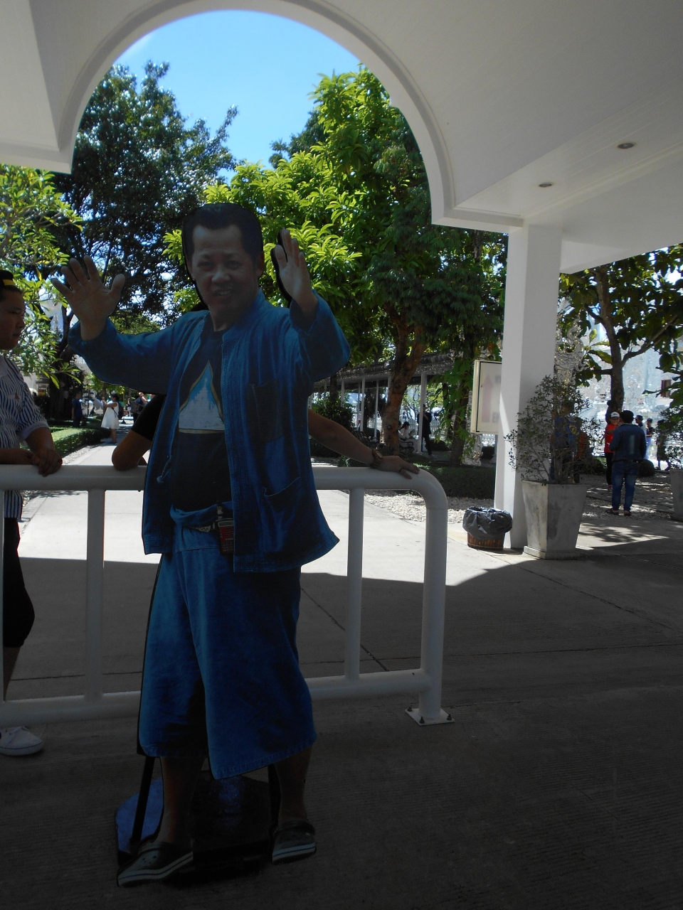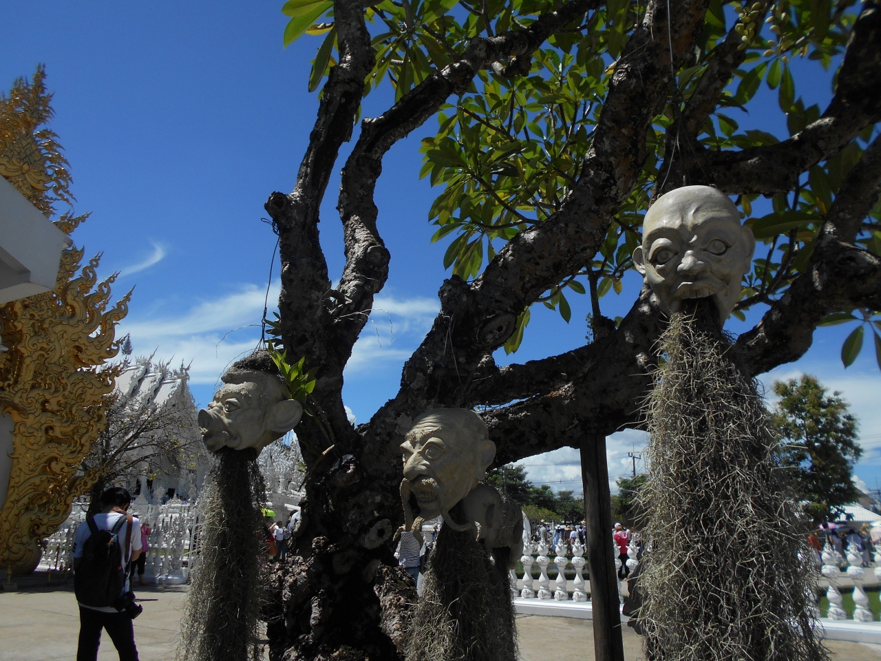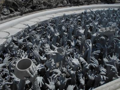 本殿他はすべて白いのがホワイトテンプルの名前の故ですが、本殿(ここだけ内部撮影禁止。鎮座する仏像の周りを囲む壁も面白い)に入る前の池には地獄絵図。ビビりな人には向かないかもしれないけど、訪問客が多いので怖いという気分にはまったくならないだろうと思います。