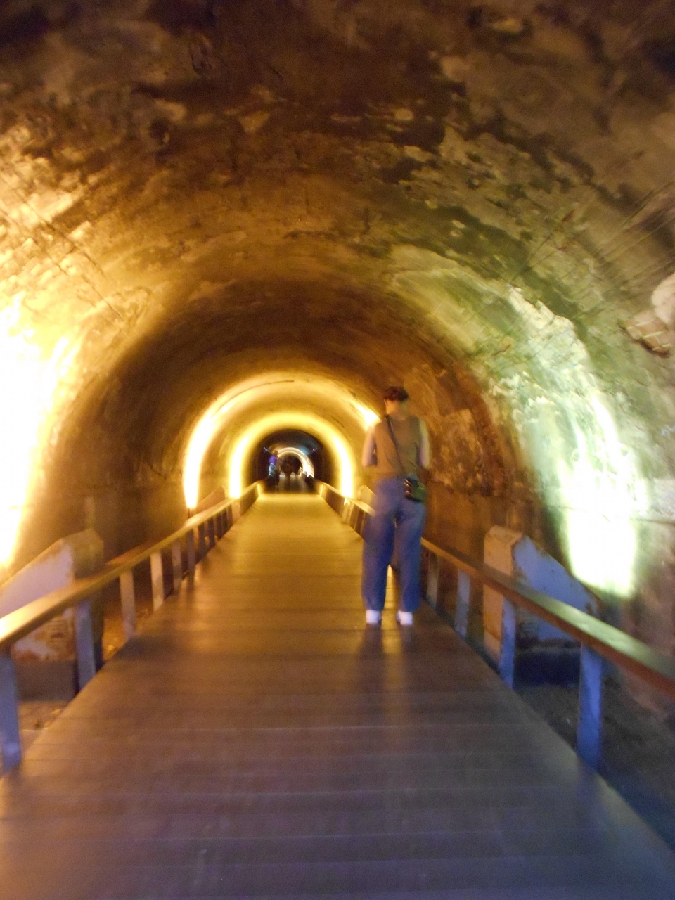 歩行者用の100mもないのトンネル内は薄暗いですが足元には木道を後年敷き詰めて歩きやすくなっており、途中にロマンチックに星空をちりばめたドームを通過して通り抜けるようになっています。