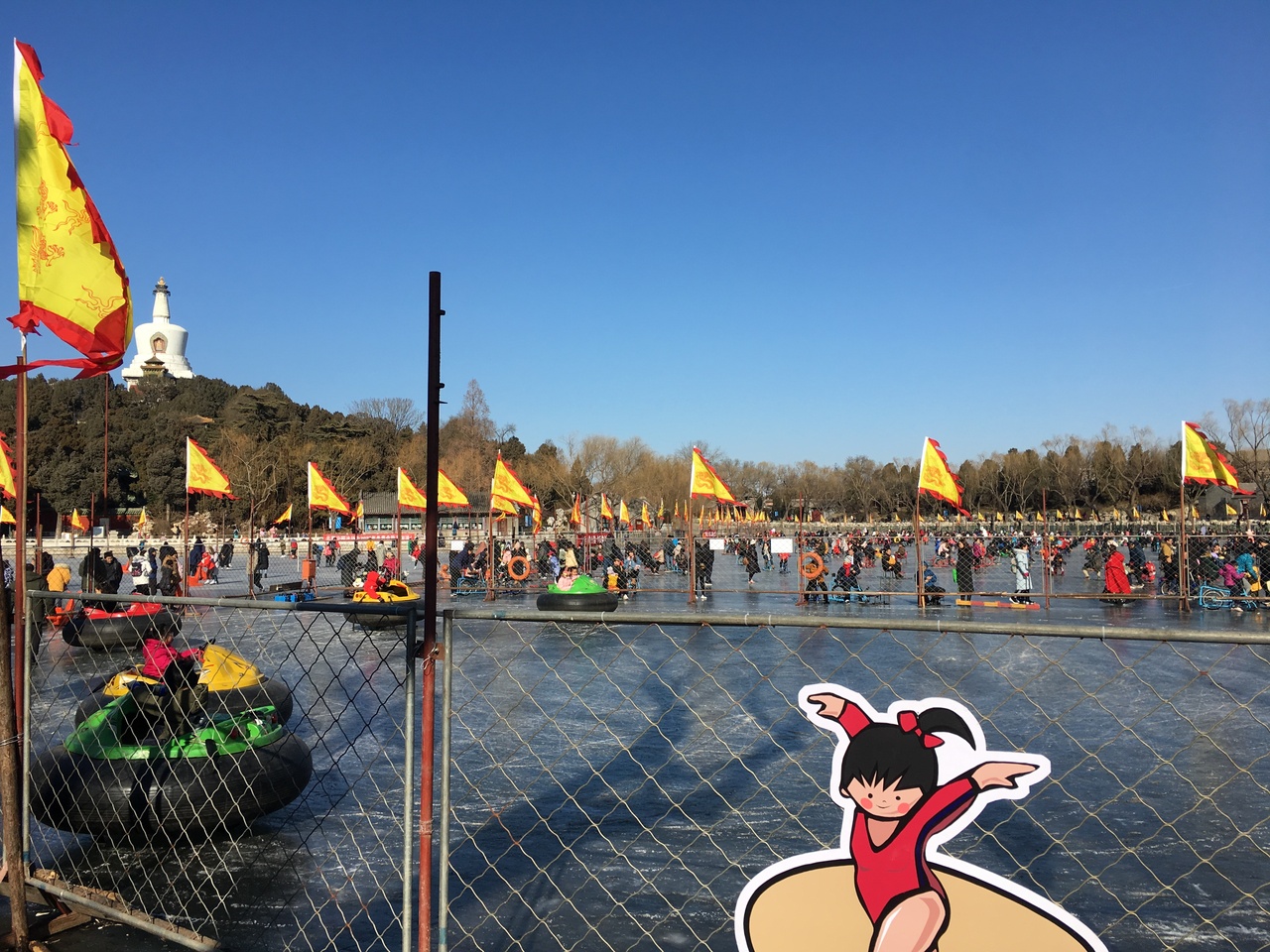 北海公園の入場料とは別にエリア入場が80元、動力付き乗り物を使う場合は別料金、人力自転車やそりは無料。入場するまで少し行列、中に入ってからも乗り物が空くまで氷の上で争奪戦してました。