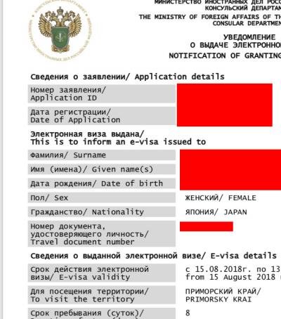 昨年夏から実施されているウラジオストクのある沿海州限定電子ビザ(滞在は8日間限定)をとって行きましたが、入国予定日の3週間前からの申請(9/3入国予定→8/14ビザ申請)で2日後にはビザのPDFファイルがメールで送られてきました。(受付〆切は出発4日前まで)