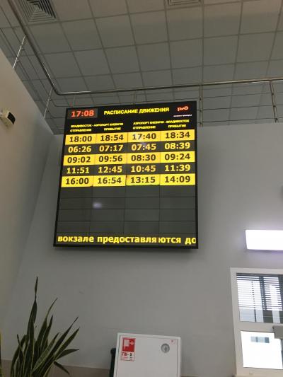 成田空港からのS7航空では最終列車(17時40分発)に間に合いません。オーロラ航空は曜日によって捕まえられるかどうか。空港行きは午前6時台と9時発が使えそうです。(最新の時刻表はウラジオストクポータルサイトで調べられました)