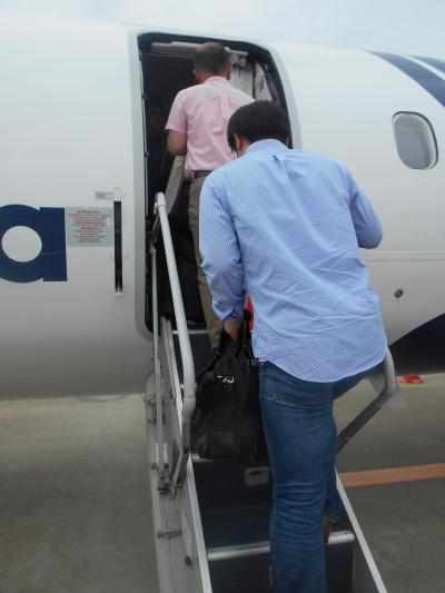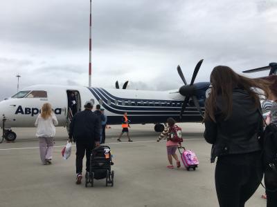 ターミナル横付けはせず、バスで機体まで送ってもらい機体に格納されていたタラップを上がるという国際線では珍しい体験できます。
