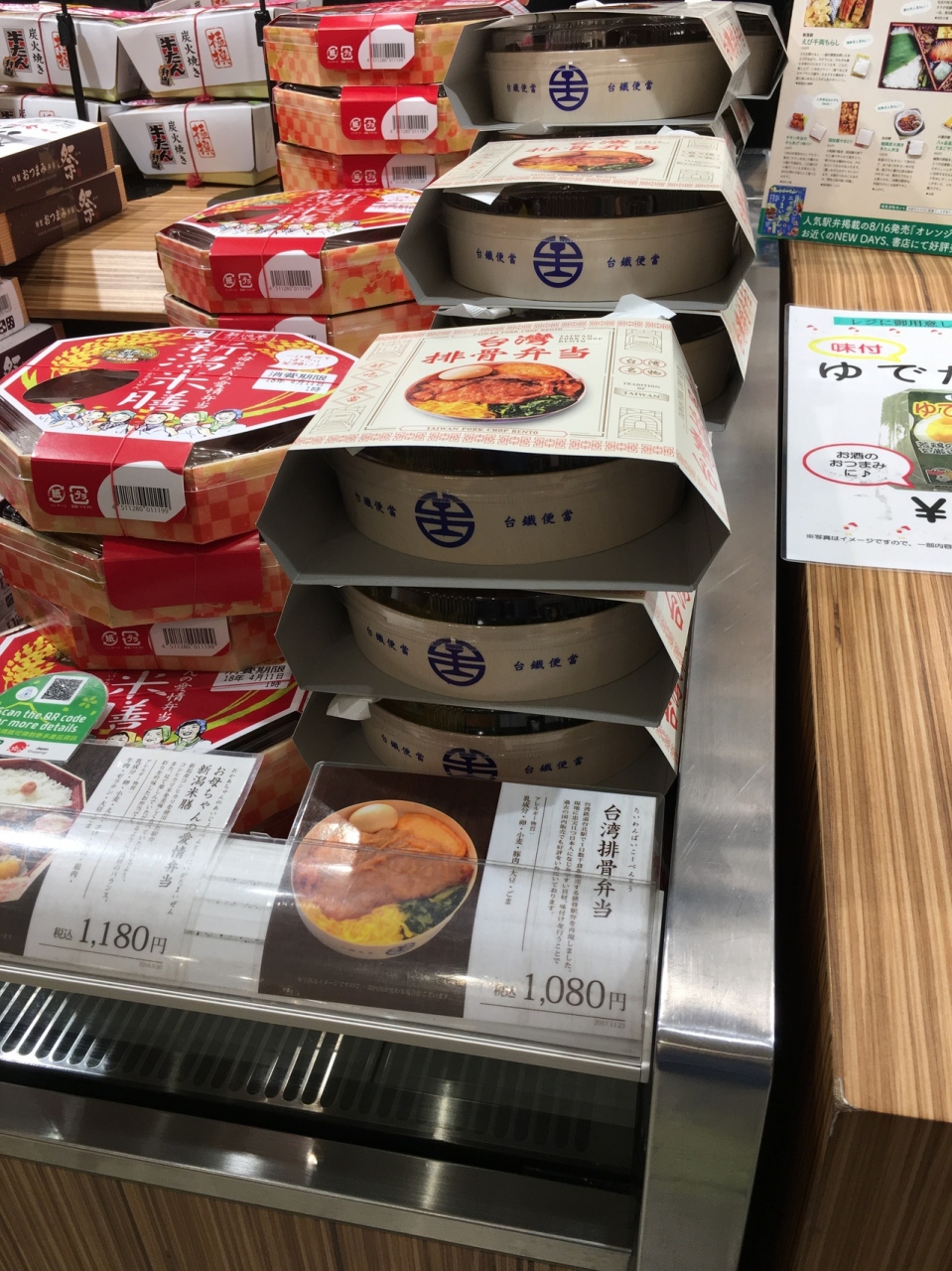 いったい何種類あるんだろうと思うぐらいの各地の駅弁が並ぶお弁当専門店。その中でひときわ異色の台湾弁当が登場ということで、途中下車(正確には改札から外には出なくても大丈夫なんですが)してお買い求めしました。パッケージは台湾のものを再現です。