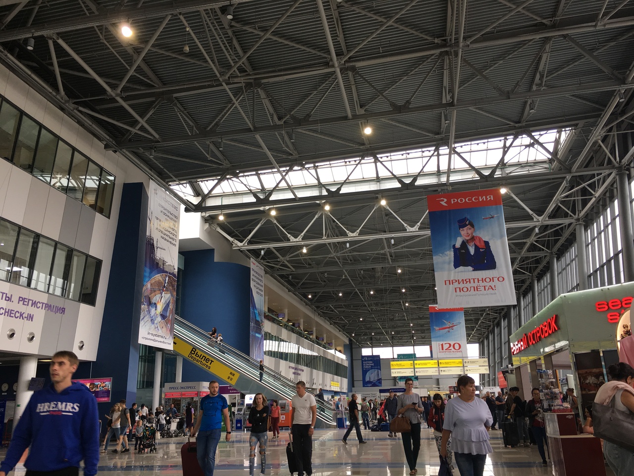 旅客ターミナルは1つのみで、1階入口側から向かって左が国際線、右が国内線で真ん中に階上搭乗口に向かうエスカレーター、左手奥にアエロエクスプレス空港駅への連絡通路あり。国内線側のお店は未見ですが、左手端にお菓子などが買えるコンビニあり。(市内より高い)レストランはなくカフェのみ。