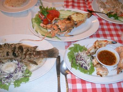 ロブスターはチーズをのせて焼いてもらいえびは塩焼き魚は素揚げしてありそ...