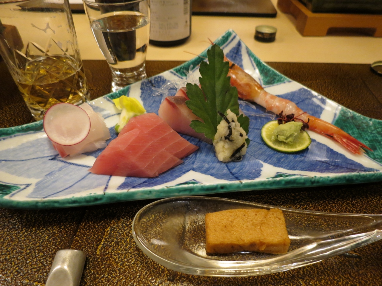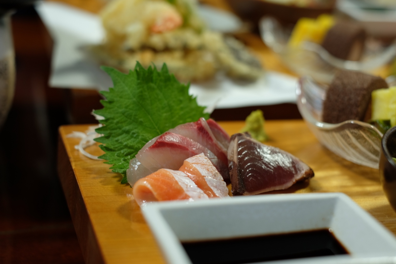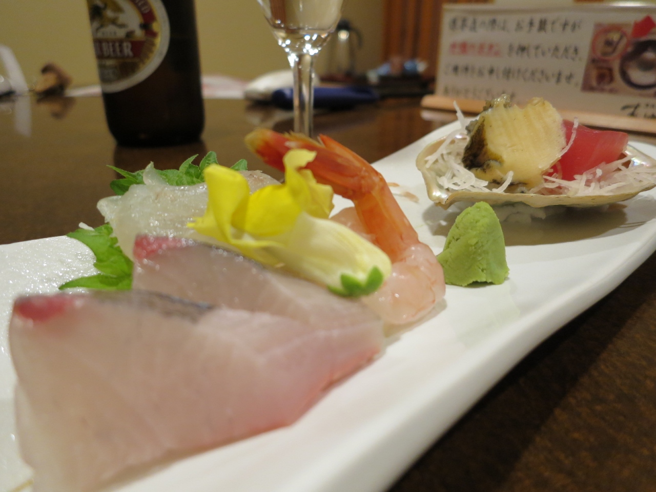 夕食は小さい盛り合わせの他にヒラメの造りもあり、