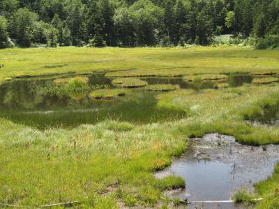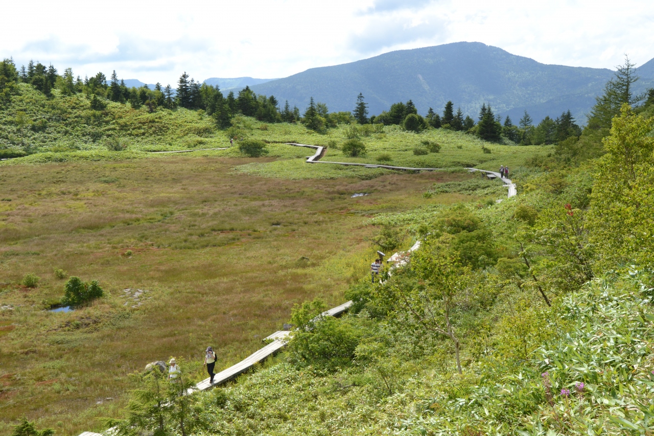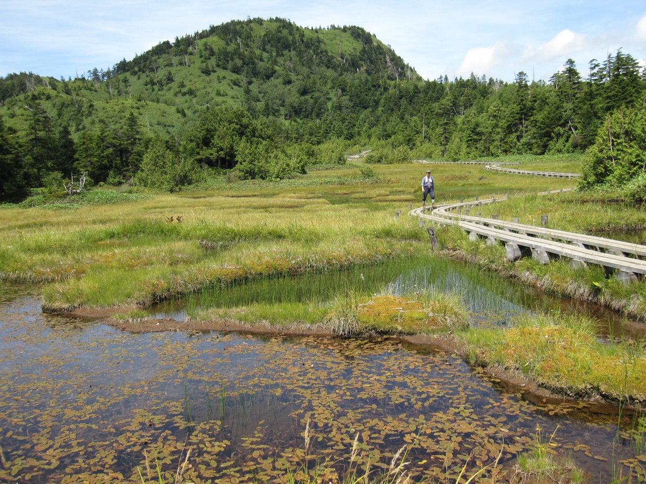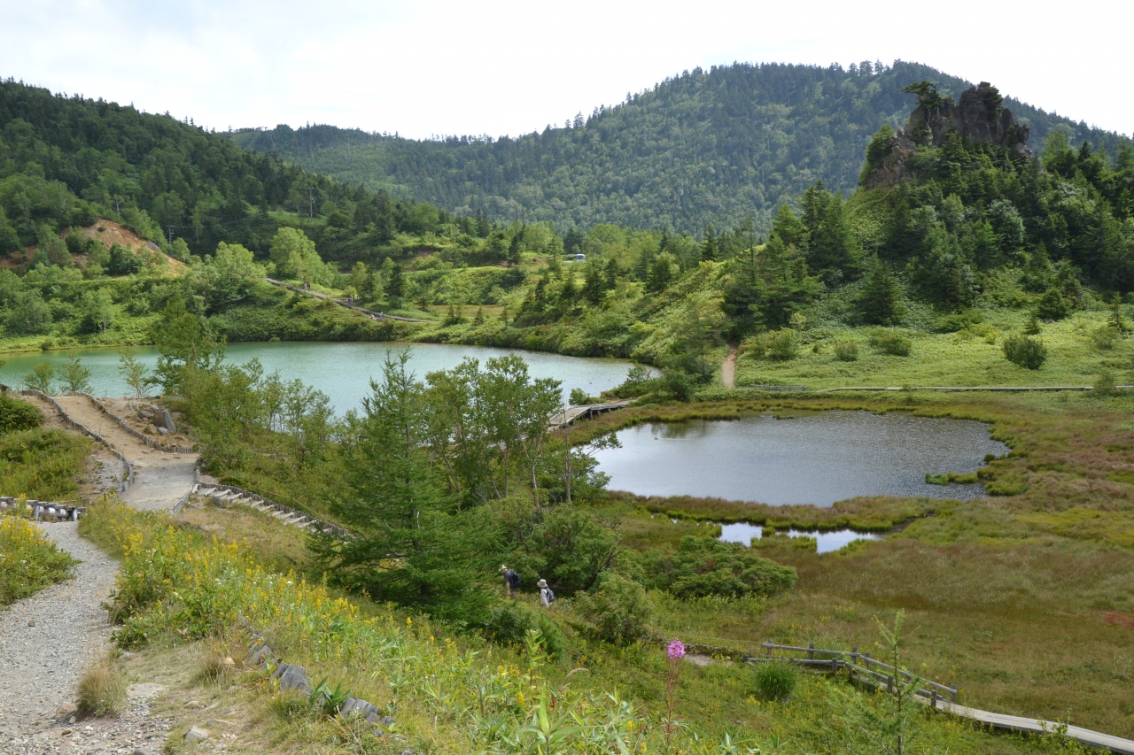 草津白根山の火山湖のひとつ。湯釜が多くの観光客で賑わっているのに対して、志賀草津道路を隔てるだけで、静かな雰囲気が楽しめます。弓池と、隣接する湿原を巡るちょっとした手軽なハイキングが楽しめます。木道も整備され、特に登山用具は不要ですが、標高2000mの高山を満喫することができます。