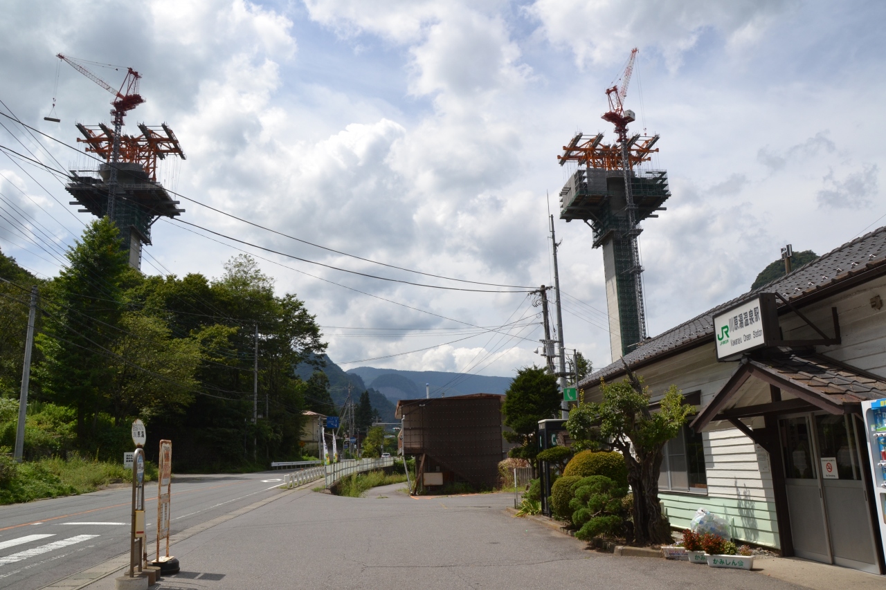 現在の川原湯温泉駅は、以前あった駅前の民家もダム建設計画に伴い移転していて、周囲には民家はありません。代わって頭上に工事中で足場に囲まれた湖面橋がそびえています。- 旅行時期