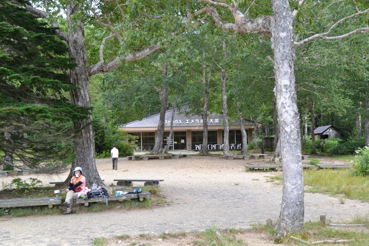 四十八池から来た場合は、長い下りに山道を下り終えた後、大沼池入口バス停からは長い登りの後に到着する場所で、疲れた足を休めるには好適な位置にあります。