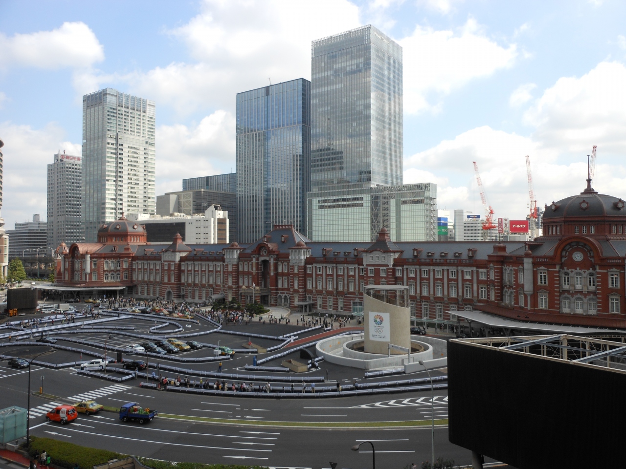 向かい側には2012年10月1日より復活新装オープンした東京駅赤レンガ駅舎があり、また丸ビル・新丸ビルといった近代的な高層ビルがあって、まさに東京の玄関口を構成しています。