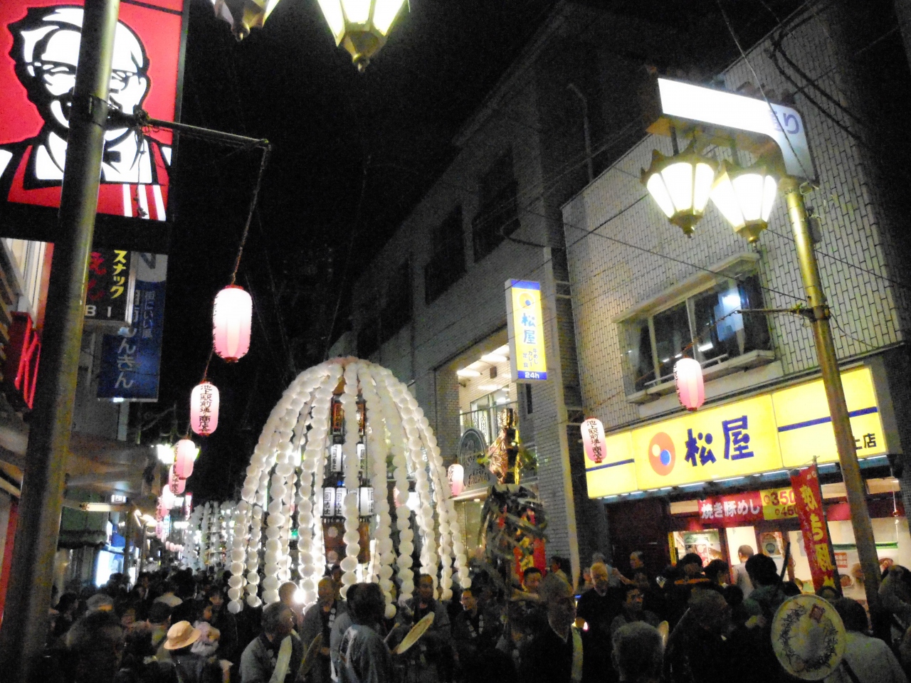 池上本門寺の最寄駅で、日蓮上人滅入の霊場として多くの参拝客でにぎわっています。とりわけ10月のお会式の万灯練行列の際には駅周辺にも、沢山の万灯行列が出て大変な賑わいになります。お会式は日蓮上人の命日を偲ぶもので、万灯は豪華さの中にも、どこかもの悲しさを感じさせます。池上駅近くの商店街が万灯行列のスタート待機場所になっています。