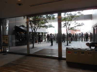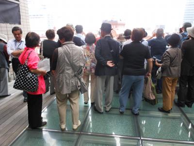 丸ビル5階のレストラン街。東京駅側に面した一角のベランダがあって、東京駅の赤レンガ駅舎や新装オープンされた東京中央郵便局の展望台となっています。新丸ビルのようなベンチで食事が取れるようなテラスではありませんが、手軽に出入りできるので多くの見物人で賑わっています。平日の昼間も、多くのツアー客が来ていました。