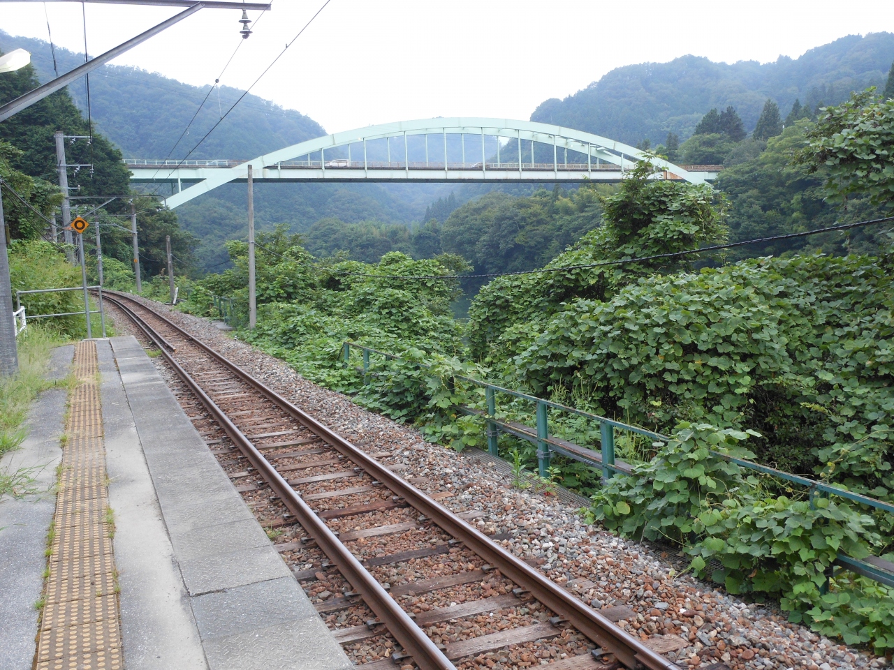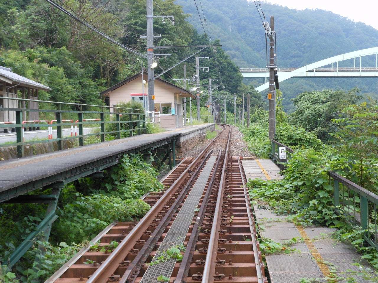 飯田線の無人駅。天竜峡からライン下りを楽しんだ観光客が下船後に電車に乗る際に利用する駅。天竜ライン遊船の唐笠港が駅前にあります。駅周辺は唐笠港の建物以外はこれといって何もなく、眼下には天竜川がゆったりと流れています。また駅の上には大きな橋が架かっていますが、これは国道151号線(通称まつり街道)から泰阜村(やすおかむら)への道です。泰阜村は山間の静かな村ですが8月の最終の日曜日にマラソン大会「ふれあいの里高原ロードレース大会」3キロ、5キロ、10キロのコースがあり、山間のアップダウンのあるコースを総勢約1000人のランナーが健脚を競っています。