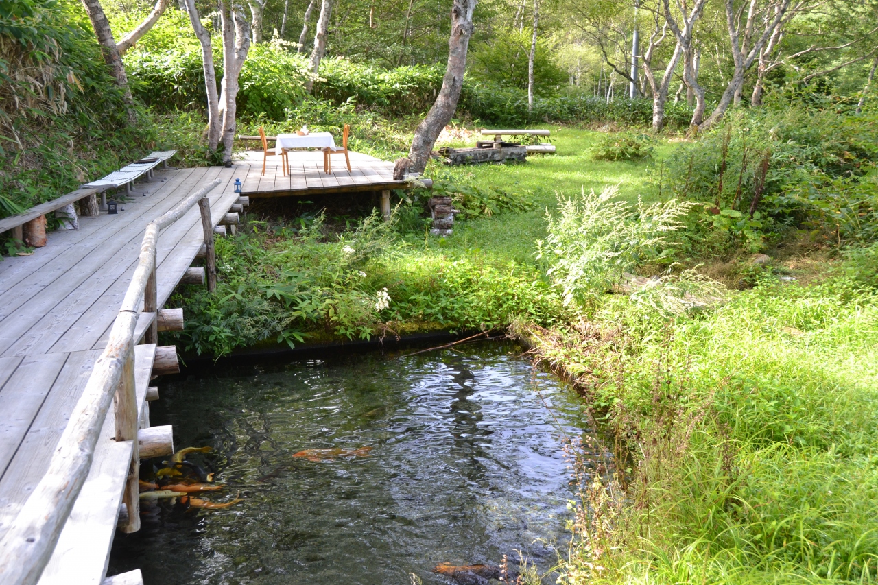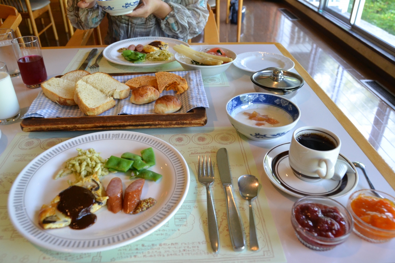 石の湯ロッジは、とても広い食堂で、美味しいお食事が何と言ってもイチオシです。朝食は夕食時に一番先に着席したお客様から順に1卓しかない屋外のテラス席の希望を聞いているようです。