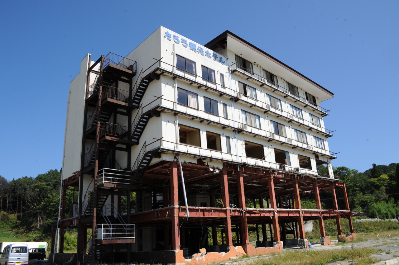 たろう観光ホテルは東日本大震災の津波被害で、ホテルとしての営業は行っていません。ホテルのある田老地区の第二防潮堤の周辺は、とりわけ被害が甚大で、3階まで津波で外装が流されたたろう観光ホテル以外は、みな津波で流失して土台しかありません。また第二防潮堤は数か所、水門が残されているだけで跡形もありません。津波の引き潮で現在でもご遺体が発見されていない方がこの地区では30人以上いらっしゃいます。