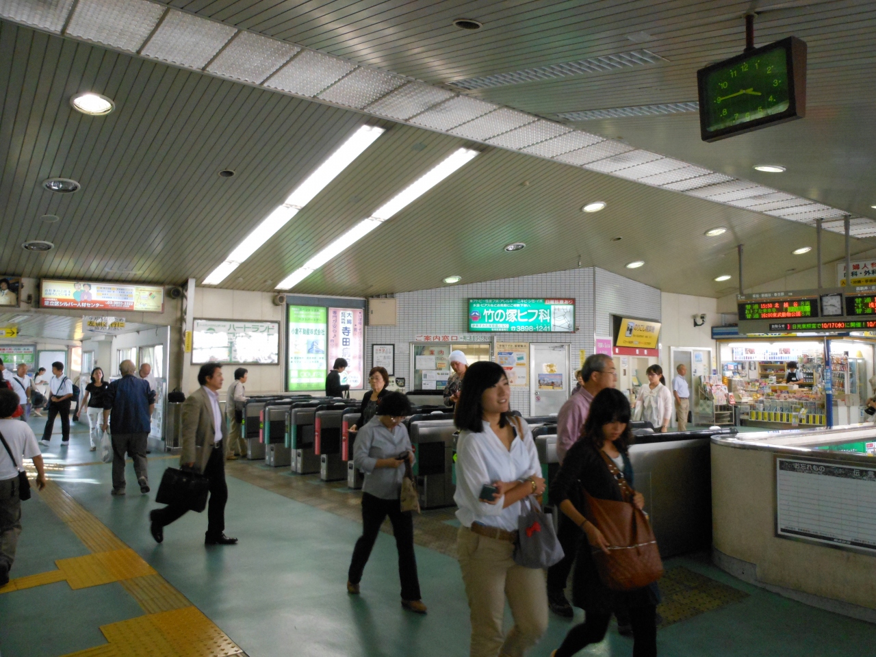 東京スカイツリーライン(東武伊勢崎線)の駅。緩行線のみホームがあって、快速線は通過です。周囲は住宅地で観光で訪れる機会はあまりないかもしれません。東口ロータリーは東武線の中でも大きい方です。駅から北の方を眺めると足立清掃工場の大きな煙突が見えます。駅の両側に電車の運行量に比べて大きな踏切があって、開かずの踏切になっています。2005年に遮断機を係員が誤って開けて多数の死傷者を出した事故が発生しています。現在では警備員が踏切監視をしていますが、閉まりかかった踏切に突入していく自転車や高齢者が絶えず、危険な状態です。2012年より高架化工事にかかるとされています。