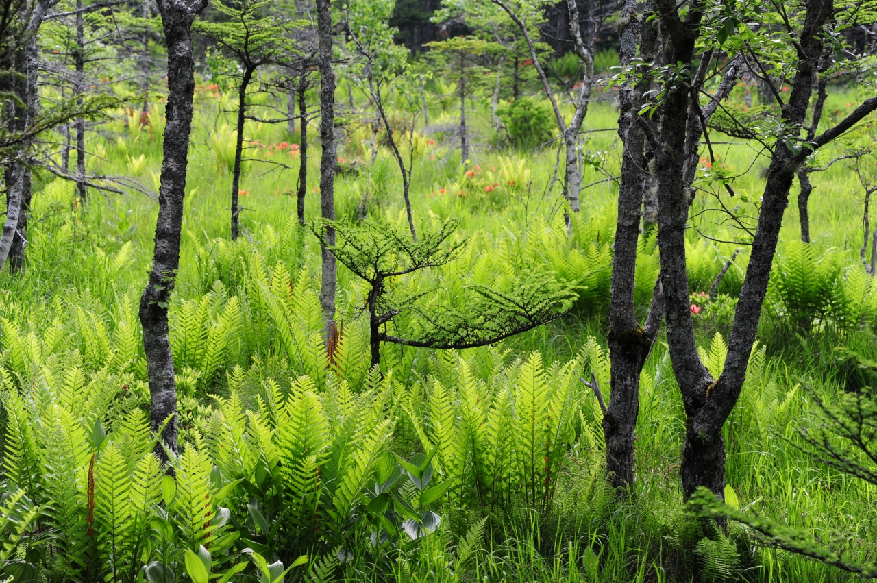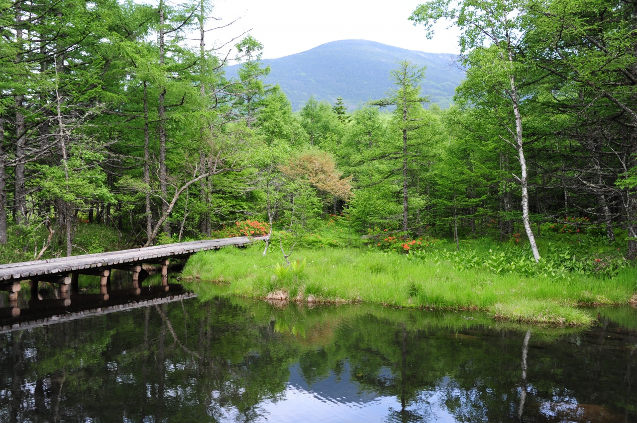 標高1800メートルを超える高地にありますので、夏でも清々しい空気に包まれています。6月下旬に訪れた時にはレンゲツツジが満開で樹林の合間に赤い花が広がっていました。園内には木道が整備され、湿原なかを散策できます。サルオガセが絡みつこう高山の樹林帯の様子を気軽に接することが出来ます。