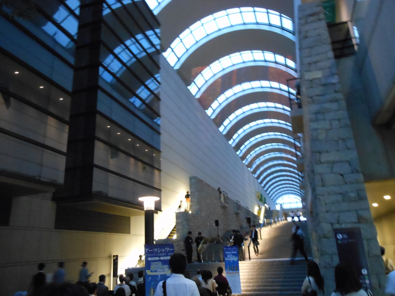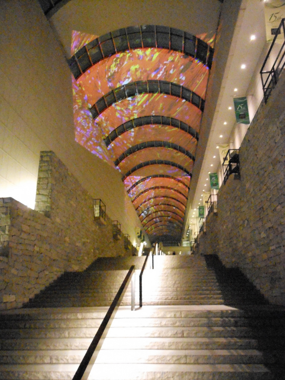 コンサートホールから甲州街道に向かう長い階段の天井には、プロジェクターによるライトアップがされていたりと、美しい装飾があります。