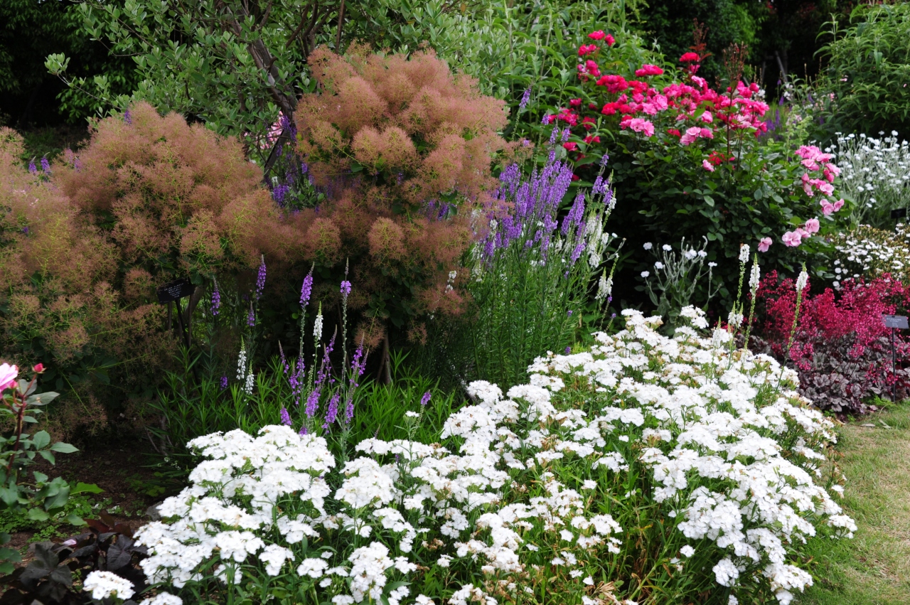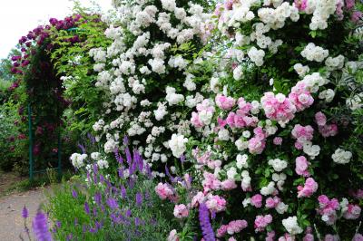 神奈川県立 花と緑のふれあいセンター。「薔薇の轍」と呼ばれるバラ園が圧巻です。野生種からオールドローズ、モダンローズまでバラの歴史を辿るように区画が分かれています。花菜ガーデンの特徴は四季折々の宿根草がバラの間合いに配置されていて、自然な庭園の景観を演出しています。バラの品種の説明をするというより、庭園回廊になっていて、そのため大変に豪華な印象です。