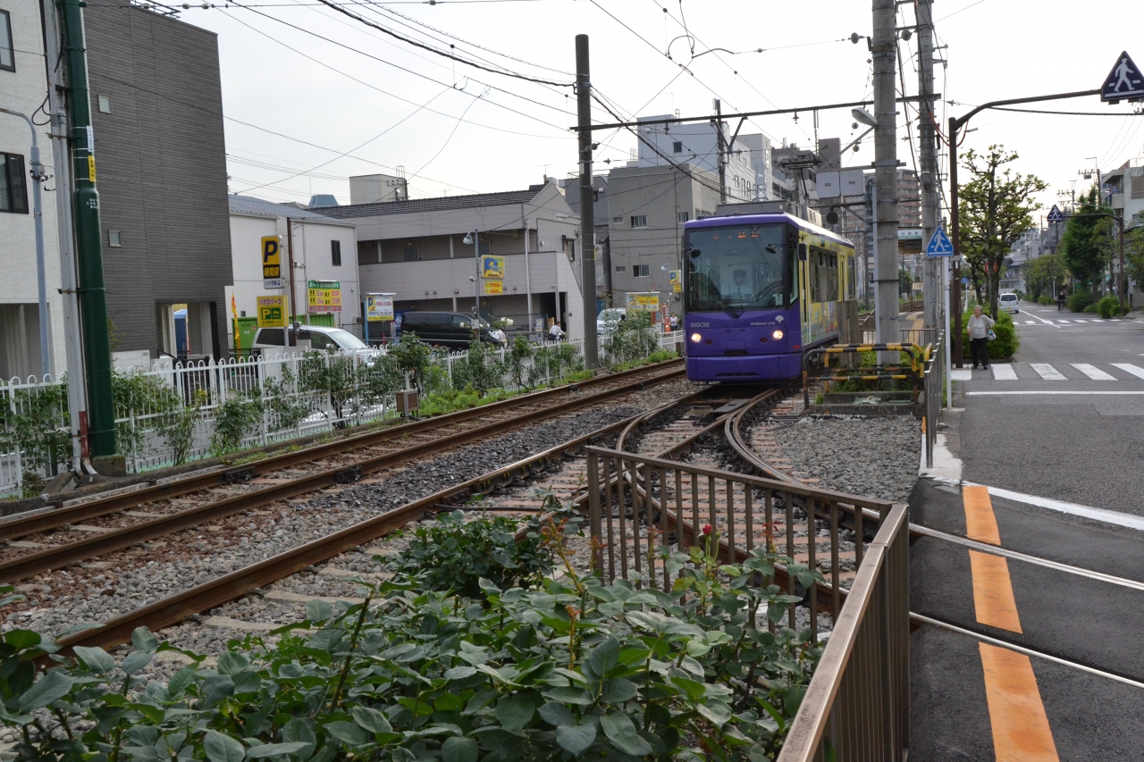 この辺り、都電は専用軌道を走り軽快な音を立ててやってきます。