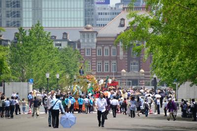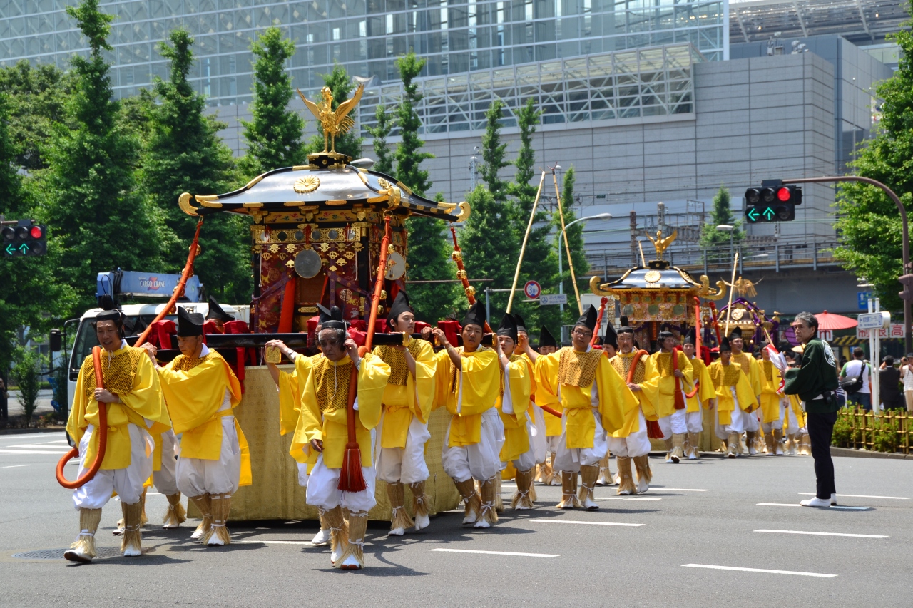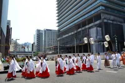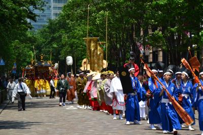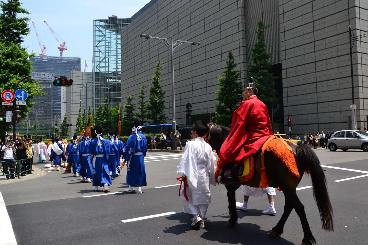 山王祭りでは神幸祭と呼ばれる王朝絵巻の装束をまとった、格調高い御列が都心の行幸が一番の見せ場になっています。溜池山王を午前中に出発して皇居の周りを半周して坂下門から東京駅方向に向かい丸の内仲通、鍛冶橋通りを経て日本橋日枝神社(摂社)を往復して夕方に溜池山王に戻ってくるものです。近代的なビルや皇居の緑をバックに美しい御列が進みます。