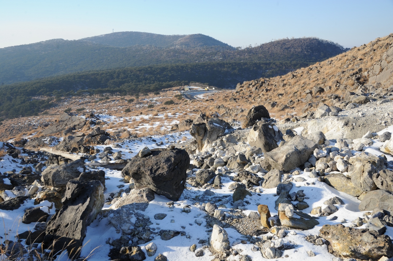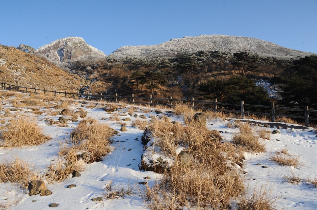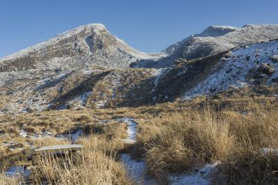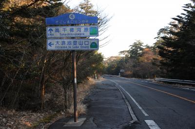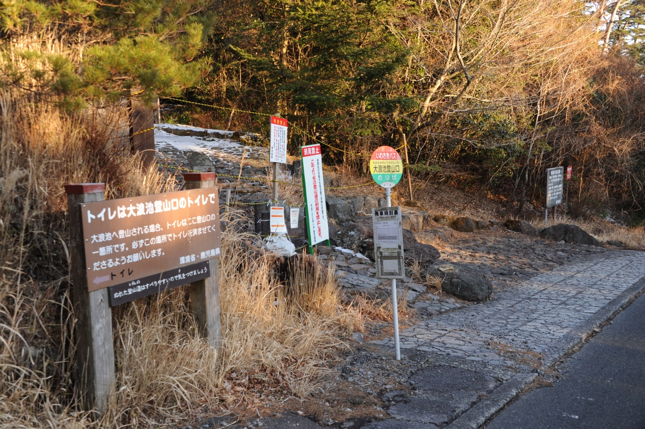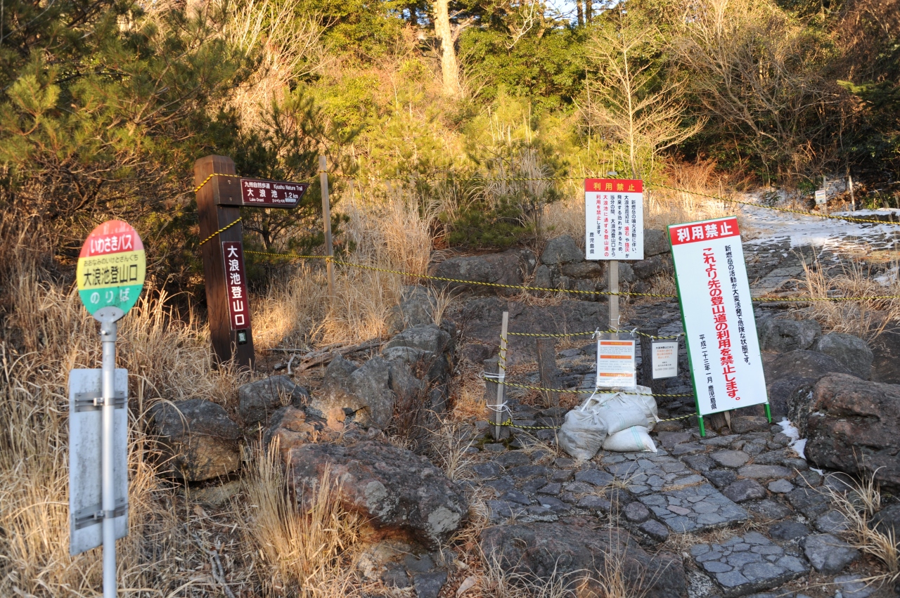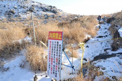 霧島連山のなかでも、えびの高原から雄姿が眺められる韓国岳。昔から多くの登山者に親しまれてきましたが、平成23年に新燃岳の噴火があって、それ以降、登山禁止になっています。登山道には登山禁止の立て札と、登山道を封鎖するためのロープが張ってあります。平成23年12月の時点でも空振(くうしん)を伴う噴火が時折おこるとのことで、私達が泊まった旅館では、空振で窓ガラスが割れた時に備えて、カーテンは必ず閉めるよう案内されました。