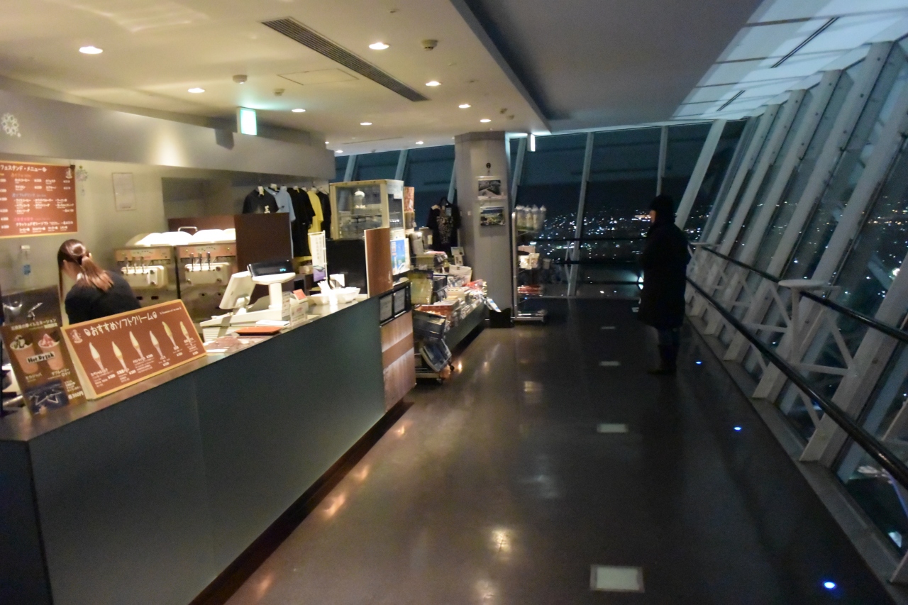五稜郭タワーの展望台(入場料要)に上がるとエレベーターは展望2階(上層階)に到着します。五稜郭のライトアップの時間帯は照明を落として、室温も低めでガラスが曇ら無いよう観覧に適した状態にしています。下に降りるには階段で一つ下の展望1階(下層階)に降りる必要があります。その降りたところにカフェスタンドがあります。ただの飲み物のカウンターコーナーではありますが、五稜郭を眺めながら暖かい飲み物は体が温まります。