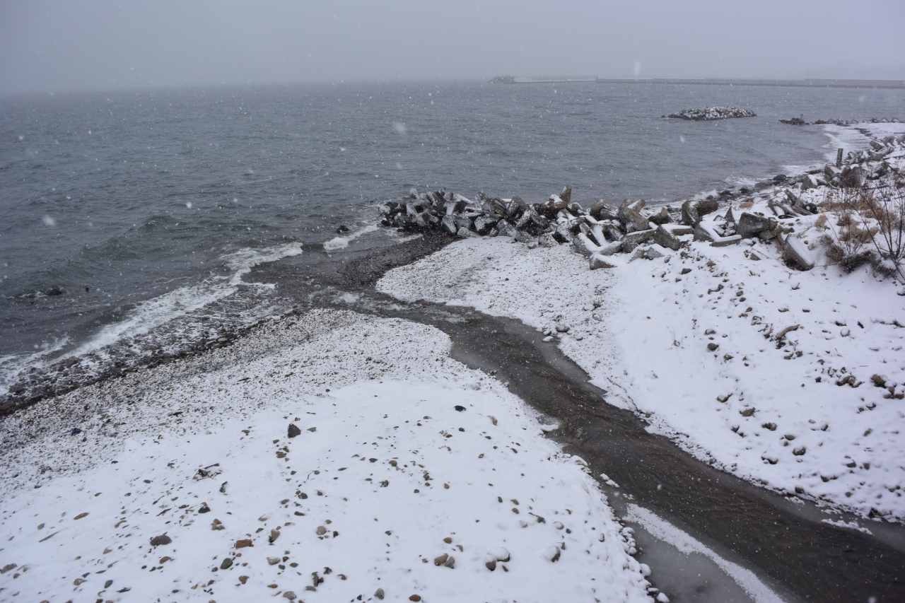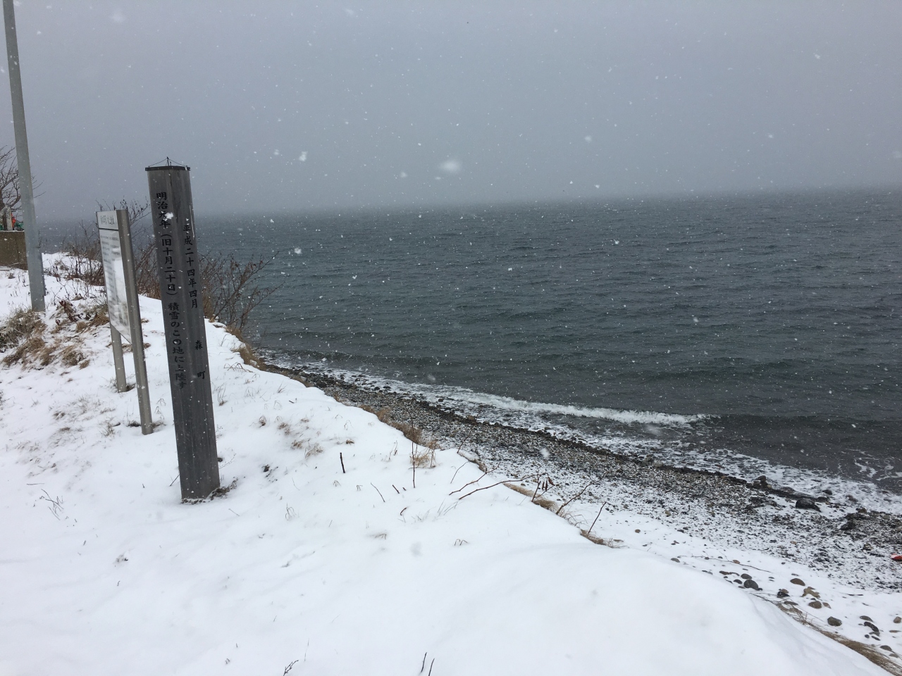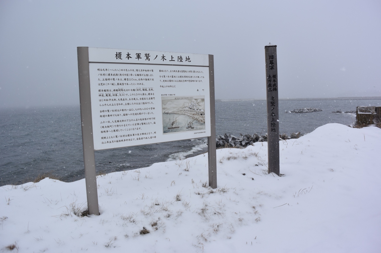 観光ガイドによれば晴れていれば駒ケ岳が望めるということでしたが、私が訪れたときは厳冬期で小雪が舞う天気で見えませんでした。近くの史跡公園内には、旧幕軍の上陸記念碑や慰霊碑があります。- 旅行時期