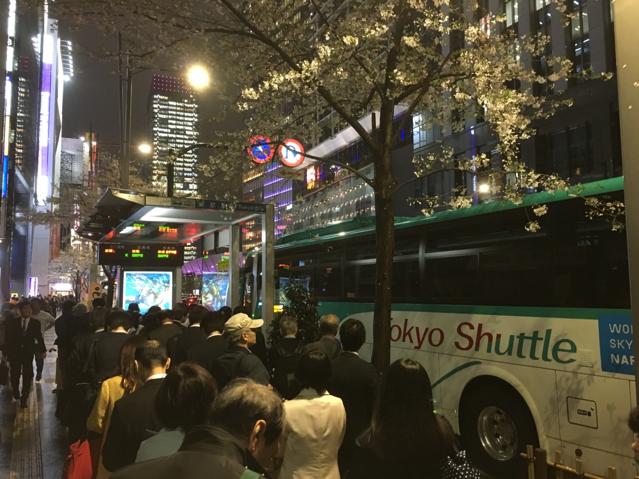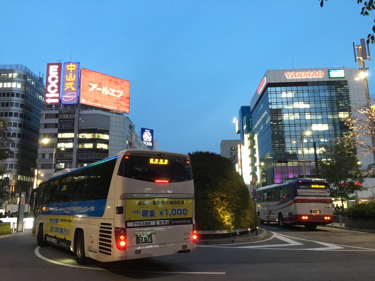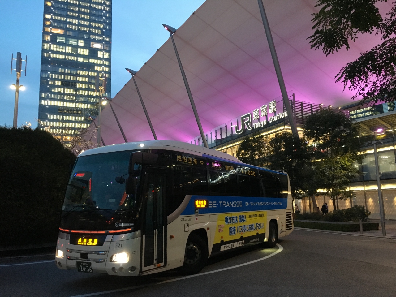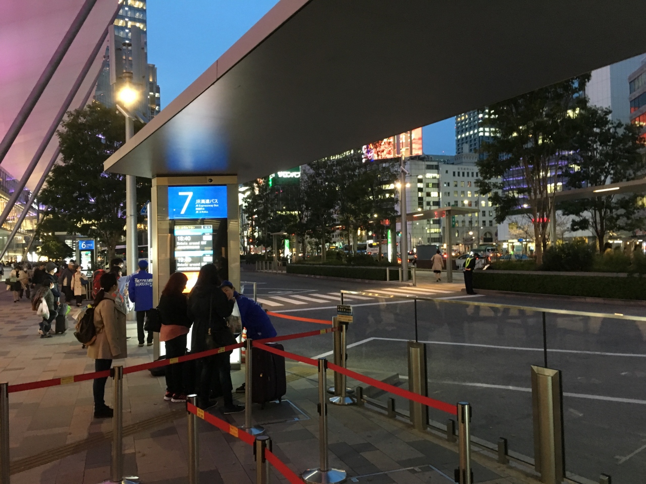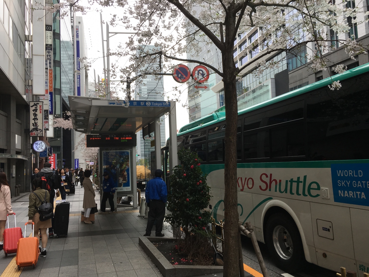 東京駅から成田空港までの高速バスは、平和交通とJRバス関東の共同運行のこのアクセス成田と京成バスが運行する東京シャトルとがあります。発着場所がバスターミナルからでグランルーフなど屋根がある場所からという安心感という点ではTHEアクセス成田のほうに分があります。東京シャトルは大丸向かい側ヤマダ電機近くの歩道上のバス停です。
