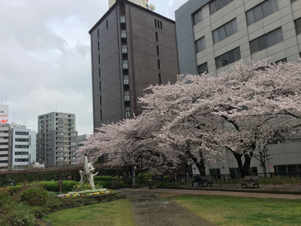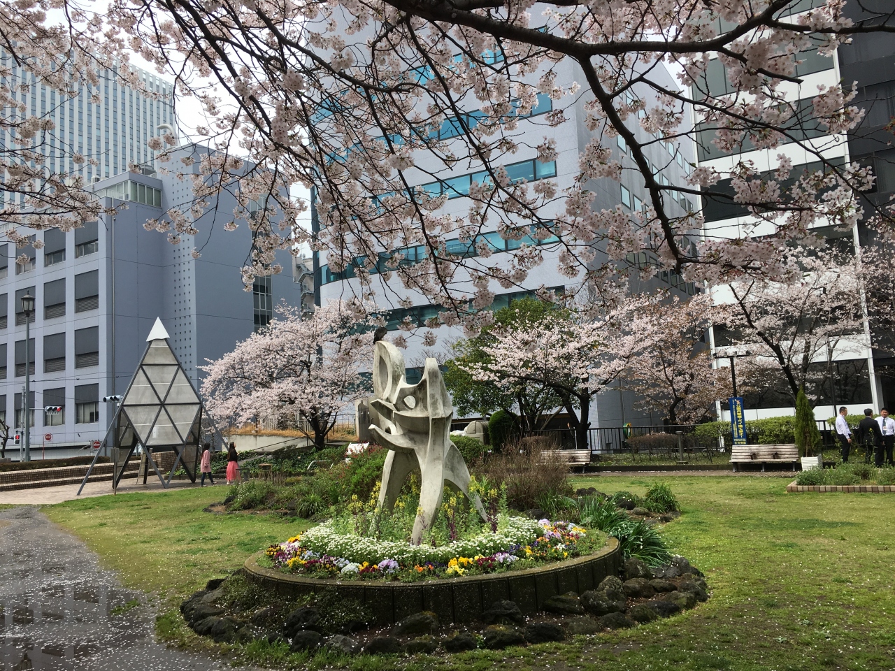 公園の周囲にはソメイヨシノが植えられていて春になると桜が美しいです。また園内には花壇や花壇の中心にモニュメントが整備されています。喫煙コーナーがあるせいか、近所のオフィスからサラリーマンがタバコ吸いに集まってきています。