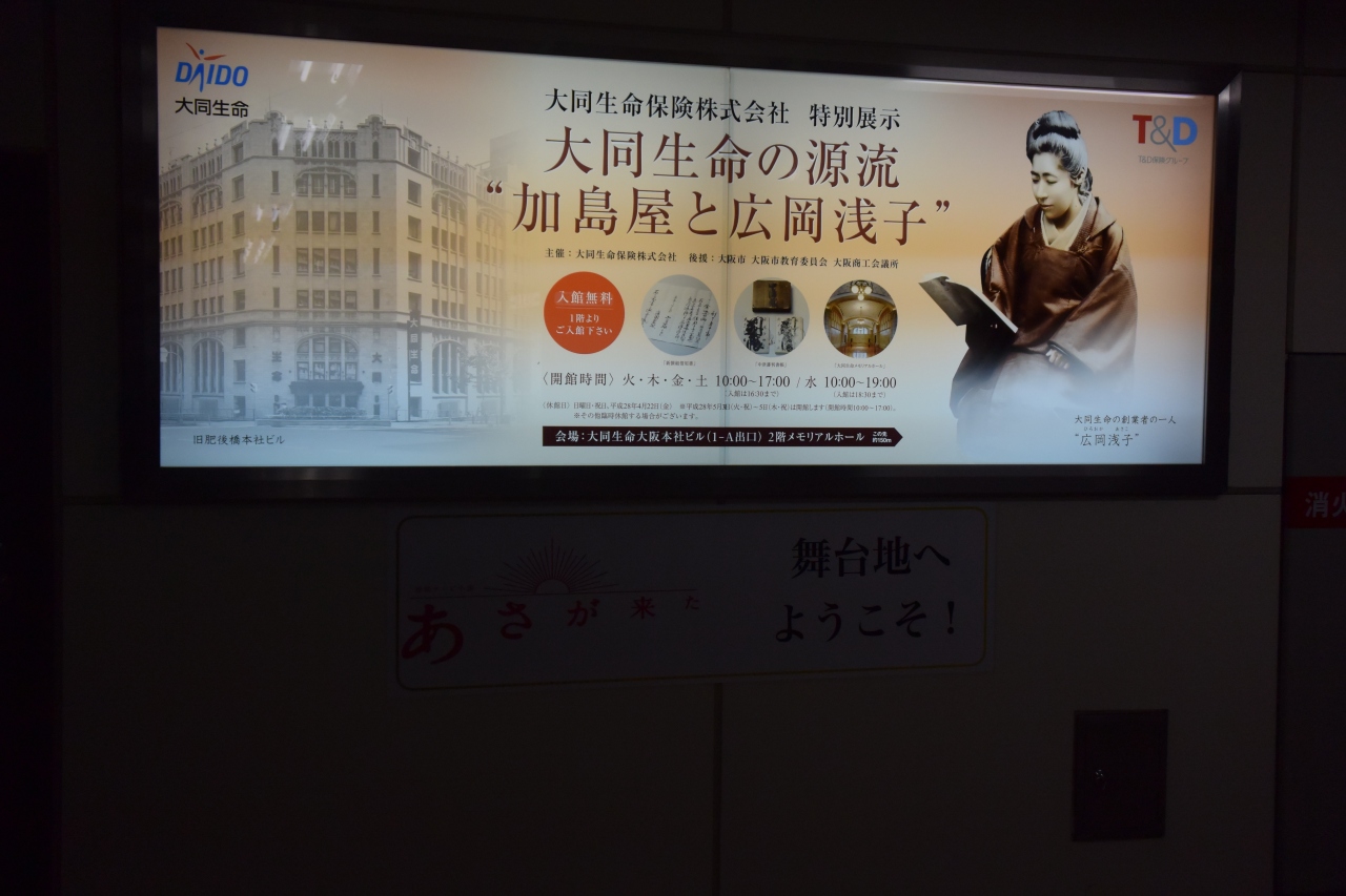 ドラマでは加納屋となっている加島屋があった場所に建つ大同生命の大阪本社ビルの2階にある展示室には加島屋の由来や広岡浅子やドラマにも出てくるその縁故者のエピソードがつづられています。個性的なアーチで構成されている大同生命大阪本社ビルも広岡浅子の親戚にあたるヴォーリズ氏によるもで、その業績にも触れられています。- 旅行時期