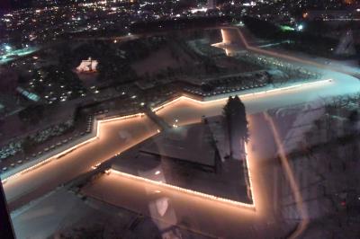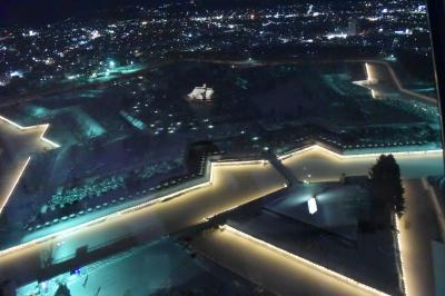 五稜郭のイルミネーションを観るには五稜郭タワーから見るのがベストです。タワーの展望室は照明を減光していてイルミネーションを観覧するのに良好な環境を作っています。星型五角形の形状をカメラに1枚で収めるには28ミリ広角でも収まりきらないくらいですが、迫力は満点です。