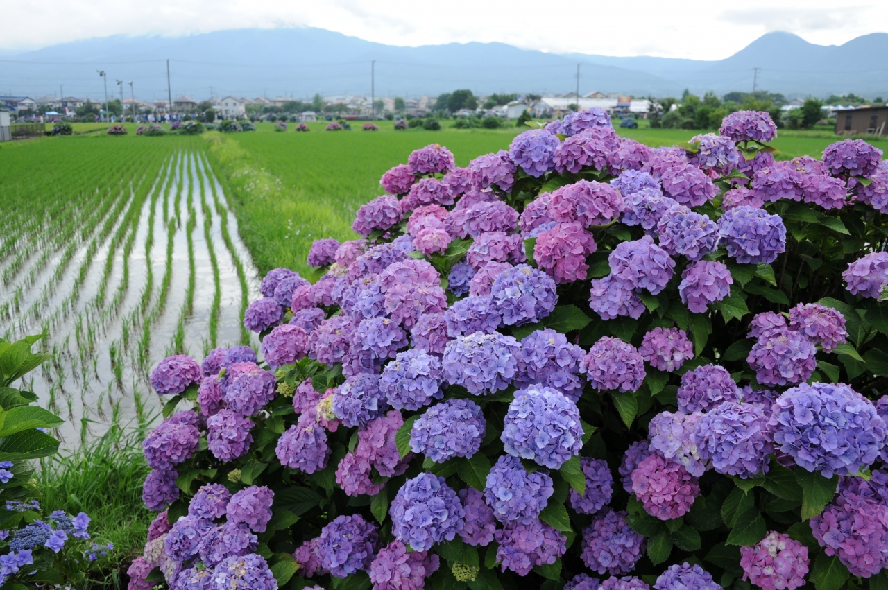 - 箱根の山々をバックに田園地帯咲くあじさいはきれいです。