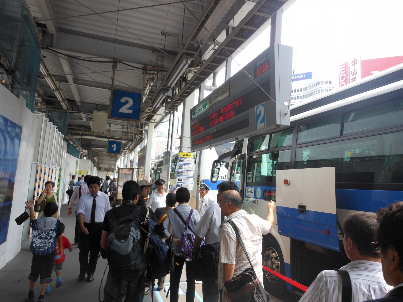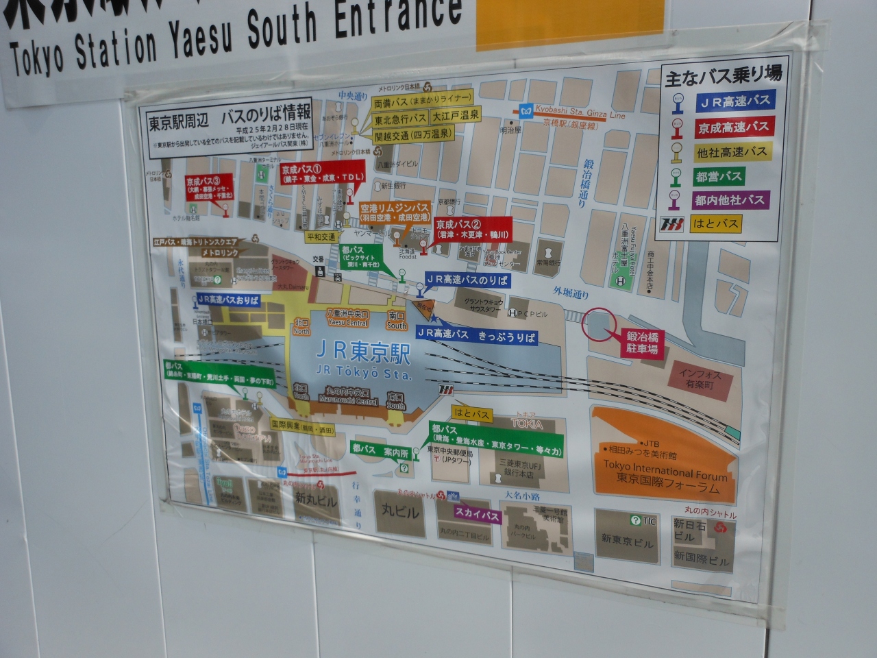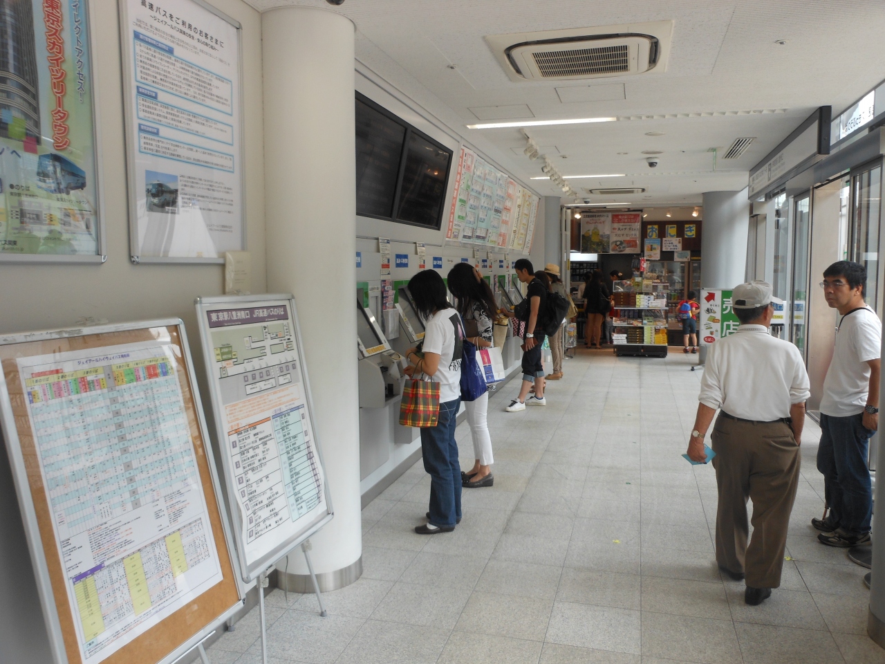 JRバスの場合、出発便は東京駅八重洲南口から中央口にかけて乗り場があります。切符売り場は南口にあります。2013年7月現在、東京駅八重洲口の整備事業の一環でグランウイングの建設工事が行われていますので、切符売り場に行くには一旦駅の外に出て回り込む必要があります。