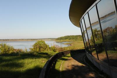 釧路と根室を結ぶ国道44号線。根室市街に入る手前、風連湖を眺める展望地にあります。風連湖は根室半島の付け根にあって、海水と淡水の混ざり合う汽水湖です。タンチョウが営巣する湖として知られ、その展望台として道の駅 スワン44ねむろは好適地です。施設の周囲には展望台のほかに湖畔の遊歩道があります。広々した観光インフォメーションコーナーには野鳥の情報などが充実しています。レストラン付ネイチャーセンターといった感じの作りです。