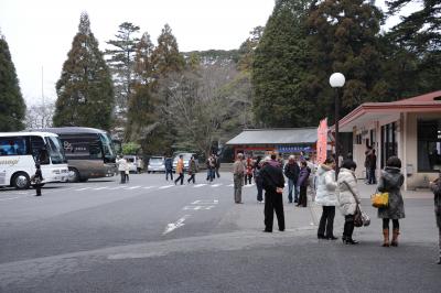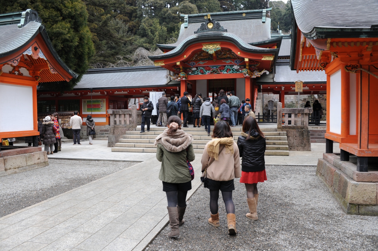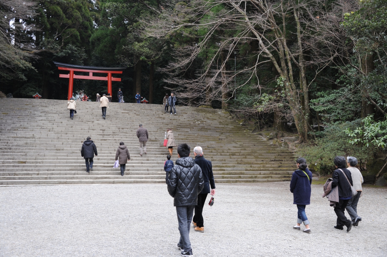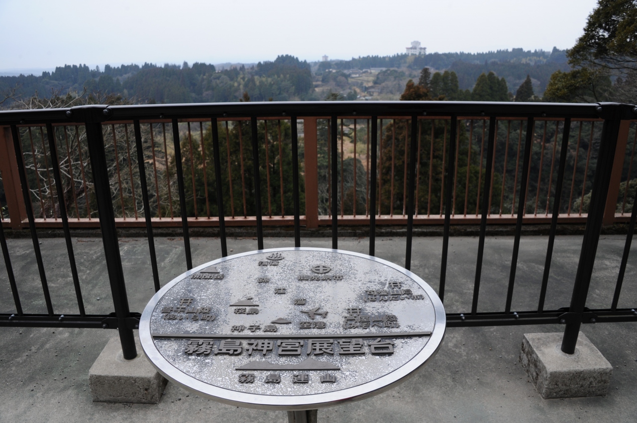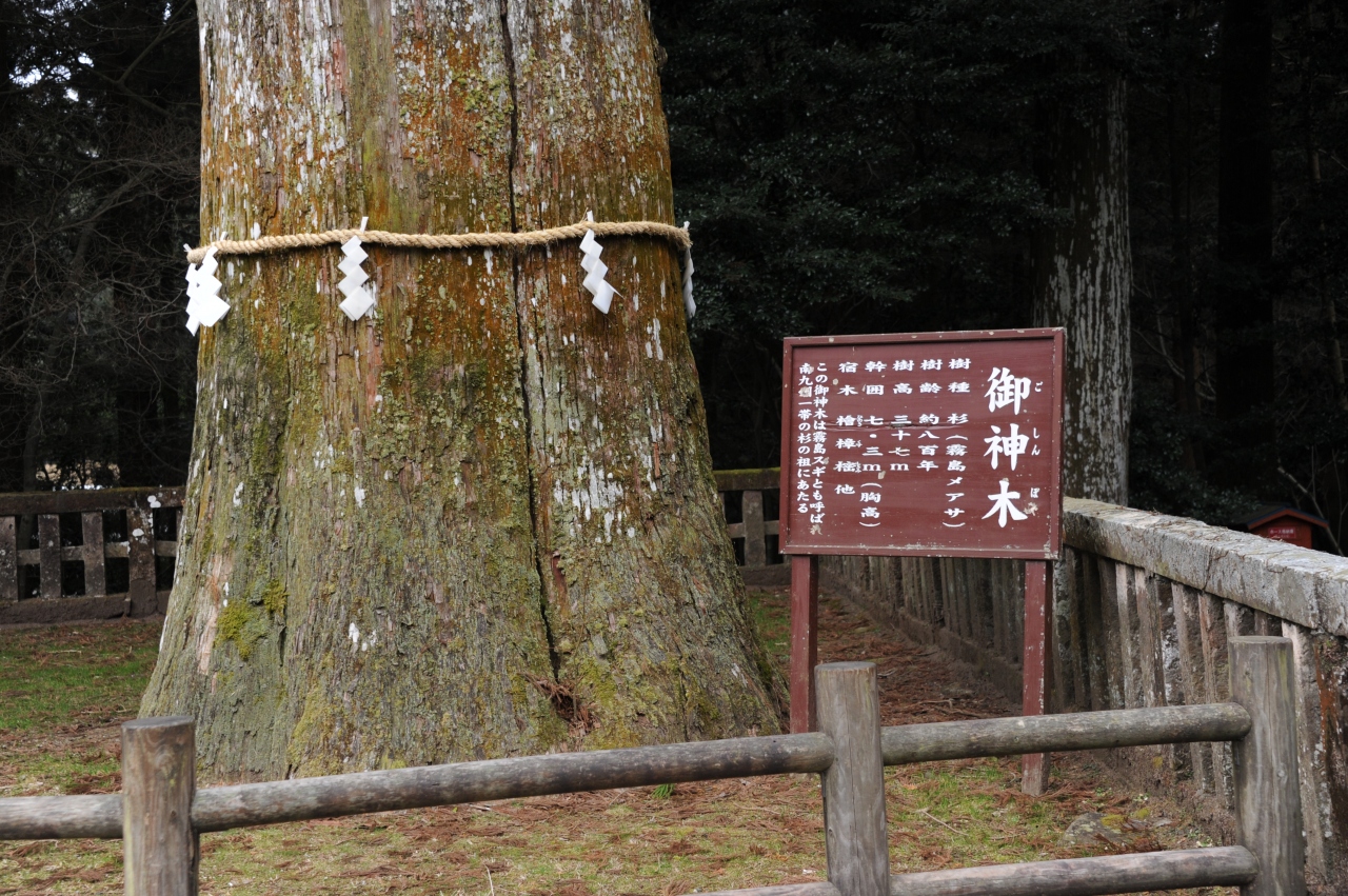 境内にあるご神木(杉の巨木)は九州杉の起源とされています。駐車場からほど近い展望台からは錦江湾の彼方に遠く開聞岳まで見えるとされていましたが、訪れた当日は曇天で見えませんでした。駐車場には多くの観光バスが停まり、参拝客が絶えない賑やかな場所です。