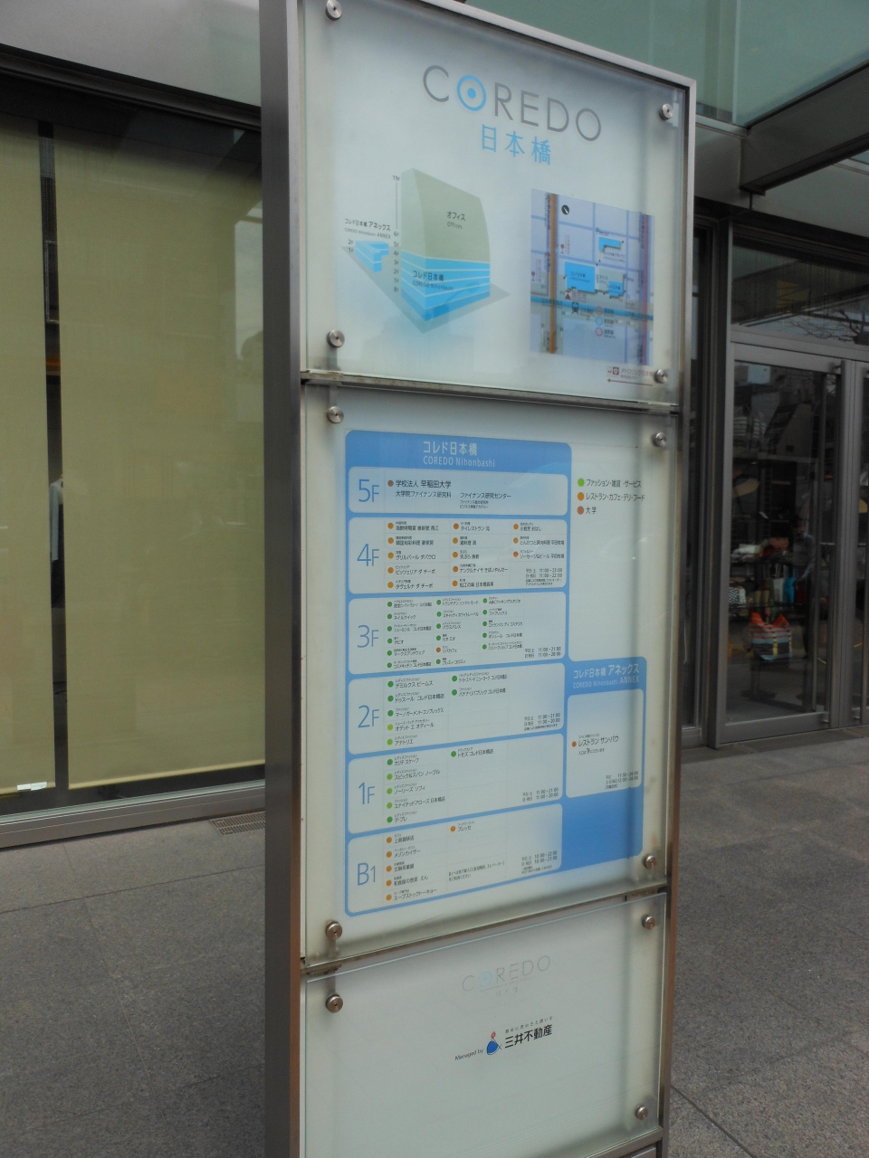 地下鉄日本橋駅、永代通りと中央通が交差する交通の拠点となる場所に位置する、商業・オフィスビルです。商業施設はB1〜4階までで、最上階は早稲田大学に学生専用フロアに、それ以外の階はオフィスフロアになっています。