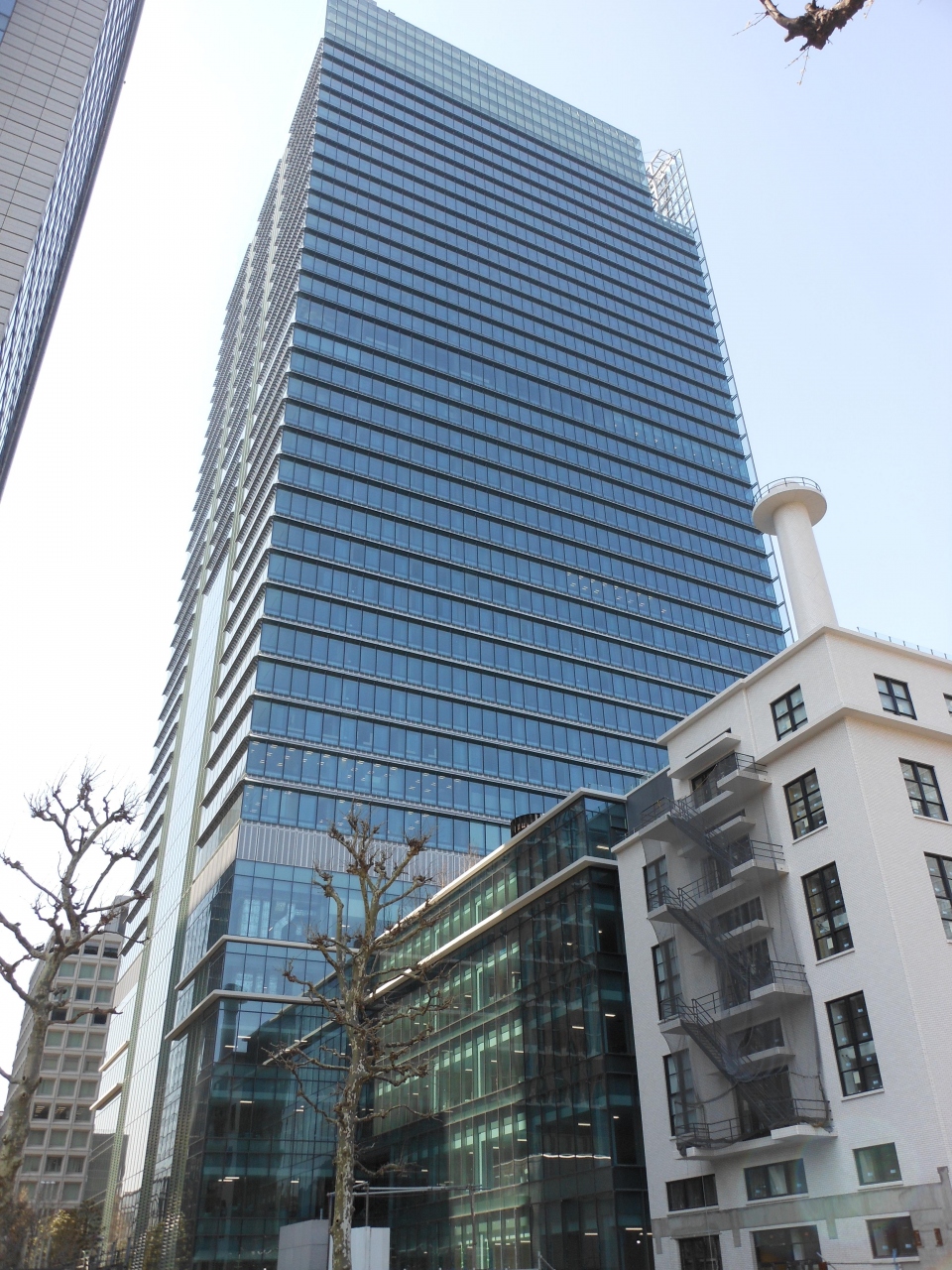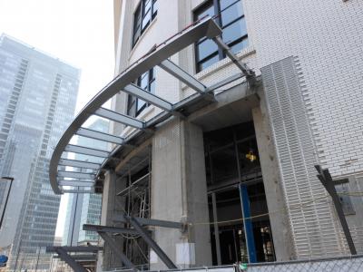 - 外壁を活用した旧庁舎の背後には、JPタワーの高層ビルが建設中です。