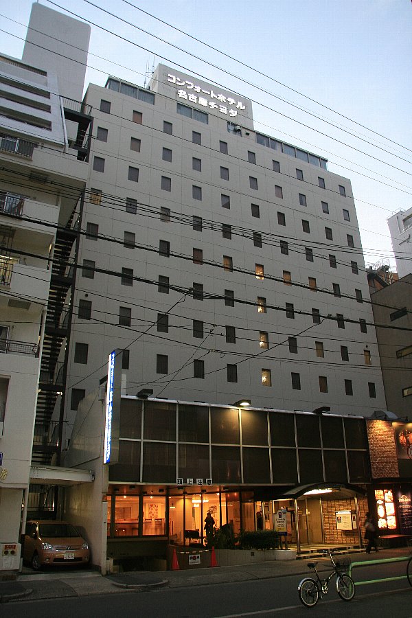 ホテルは名鉄新岐阜駅のすぐ近く。繁華街の中にあり、ビルの1~3階には居酒屋や漫画喫茶などのテナントが入居。ホテルのフロントは4階にあります。