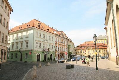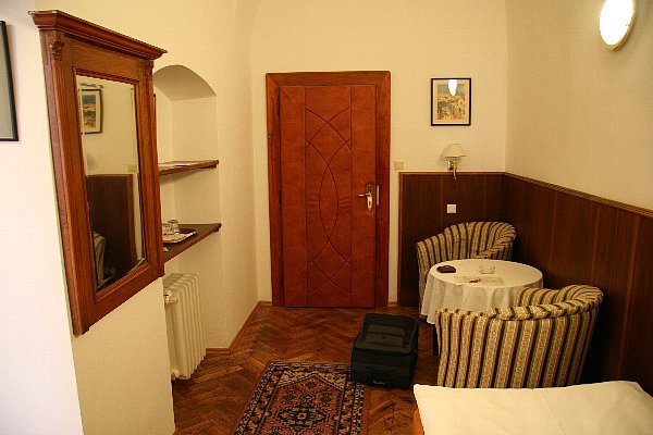プラハ旧市街広場の南西徒歩5分ほど、ベツレヘム礼拝堂のすぐ前にあるこじんまりとしたホテルです。写真左側の緑色の建物がホテルです。部屋は清潔で、屋根裏小屋チックな雰囲気のある部屋でした。ベッドが見たことないほど小さいのが難点かな?