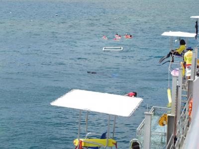 ケアンズのリーフ・フリート・ターミナルにある、サンラバークルーズ社のカウンターで手続きをし、8時半に出航する船でフィッツロイ島へ。島内を1時間散策して船着き場に戻ると、サンラバークルーズと書かれた別の船がやってきてムーアリーフへ向かいました。
