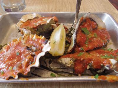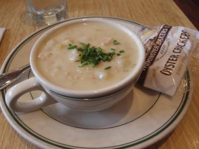 ペインテッド・レディまで延々と歩いている途中で見つけたレストラン、人が結構入っていたしクラムチャウダーがメニューに合ったので入店。1人でも快く席に通されました。クラムチャウダー(7ドル)、これはとっても美味しかった。焼牡蠣4個(14ドル)こちらはトマトベースの濃いソースがたっぷりかかっていて、残念ながら牡蠣の味は分かりませんでした。フィッシュ&チップスらしきメニューを食べている人がいましたが美味しそうでした。