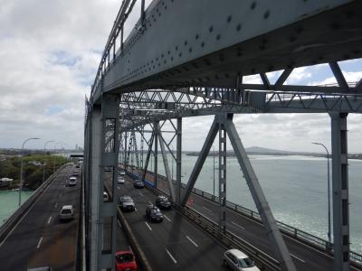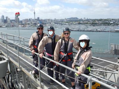 一度やってみたかったブリッジクライム。オークランドでそのチャンスがありました。ハーバーブリッジのオークランド市内側のたもとにある建物で用意されているオーバーオールに着かえ、ハーネスとヘルメットを装着。荷物はスマホさえ持っていけないのでロッカーへ(ガイドが撮ってくれた高い写真を購入しないと証拠写真残りません)。